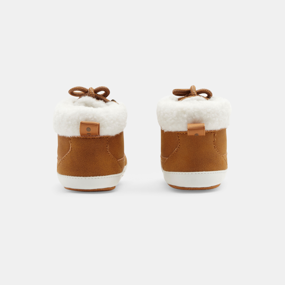 وصفي حذاء مبطّن بالفرو المصنوع من الصوف الناعم والمريح، هذه الأحذية تدفئ أقدام الأولاد في الأيام الباردة الأولى. نعل ناعم وإغلاق بأربطة.