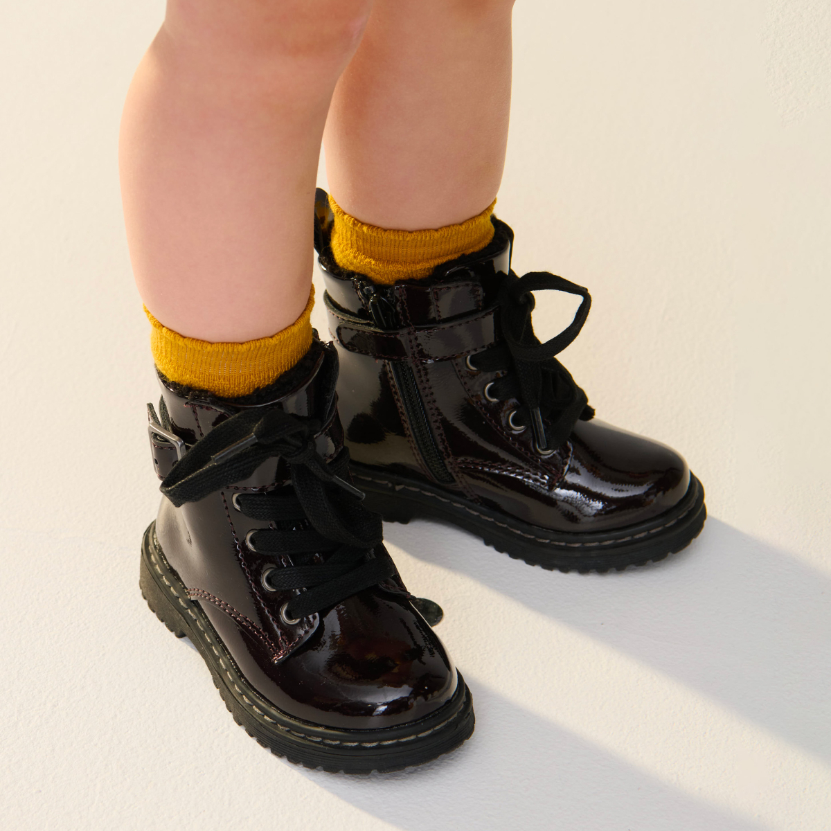 يتميز بمظهر أسلوب الروك، هذا الحذاء يعجب الفتيات. بفضل النعل المسنن، هذا الحذاء ليس مناسبًا لجميع التضاريس فحسب ولكن تصميمه وجلده اللامع يجعله يحظى بإعجاب الجميع. يتم ربطه بخيوط وإبزيم لسهولة الارتداء ومن أجل الحفاظ على دفء الأقدام الصغيرة، هذا الحذاء مبطن بالفرو!