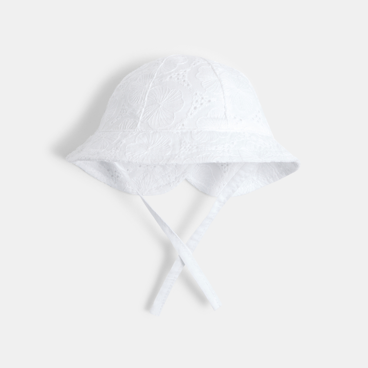 وصفي قبعة للشمس على شكل جرس بي بي بناتي. تطريز إنجليزي على قطن سادة. واقية أمامية طرية مع حواف متصالبة. مثبتة على الرأس بخيوط للربط تحت الذقن. شعار Obaïbi للزينة.