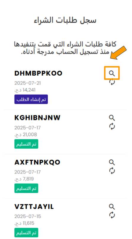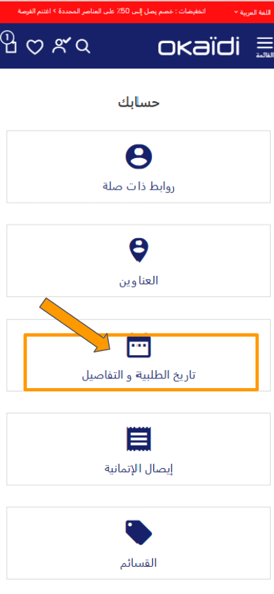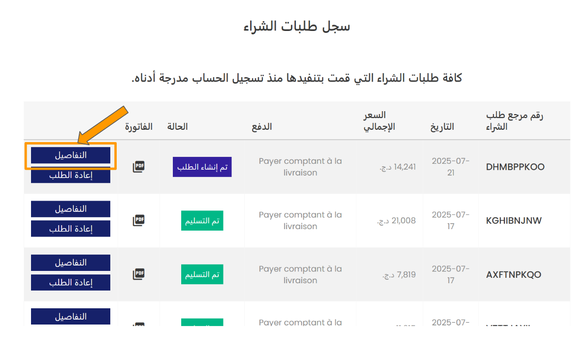 2-بعد تسجيل الدخول، اذهب إلى صفحة " تاريخ الطلبية وتفاصيلها".