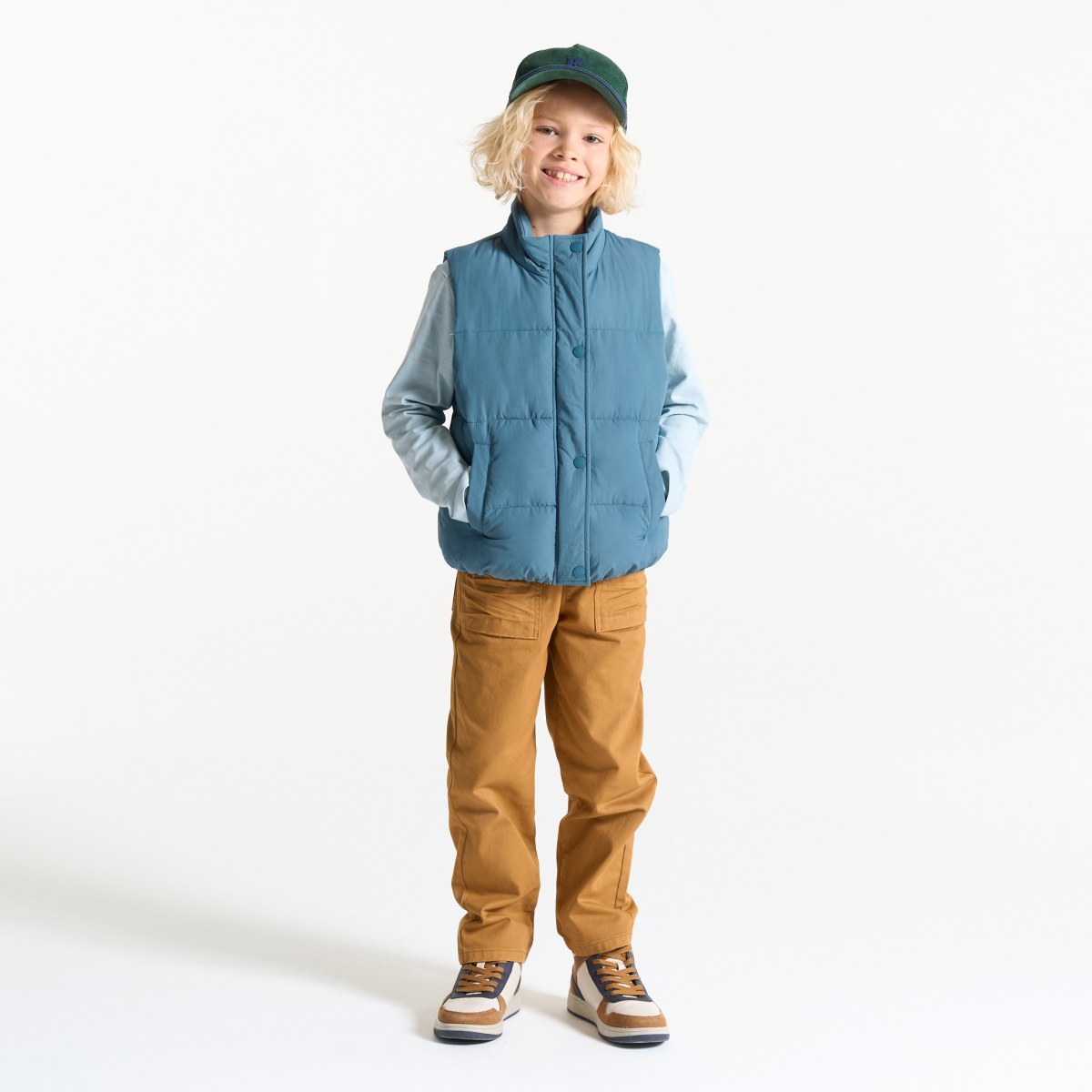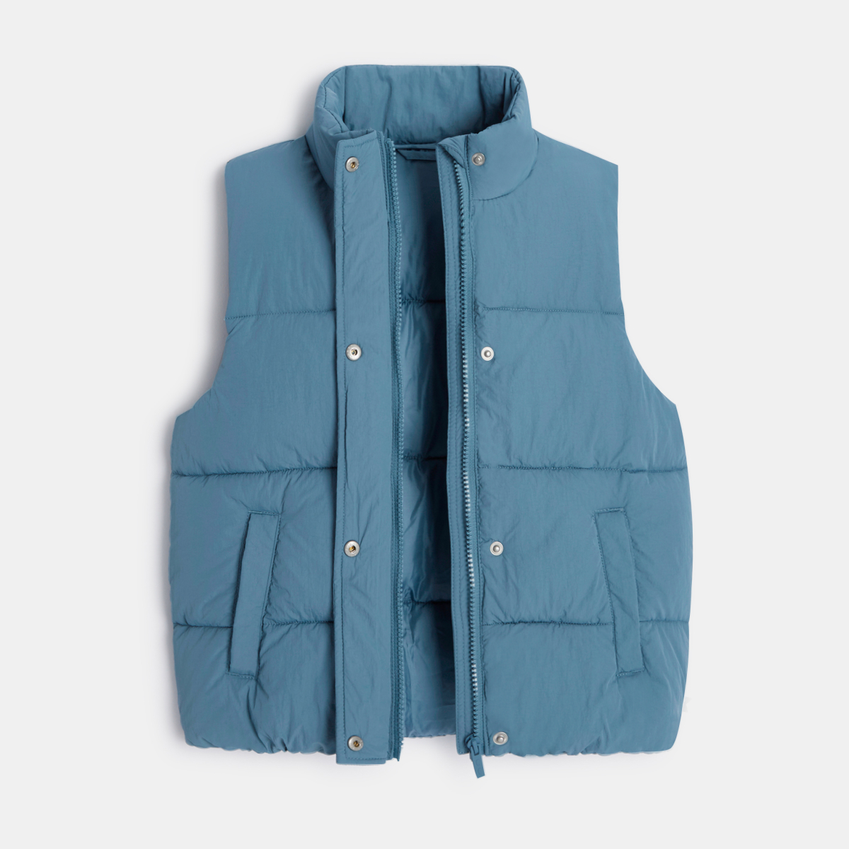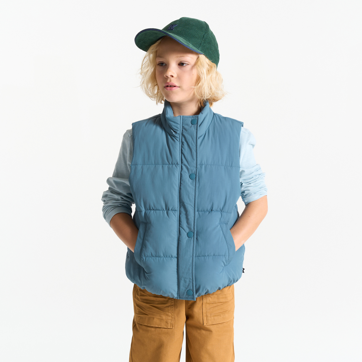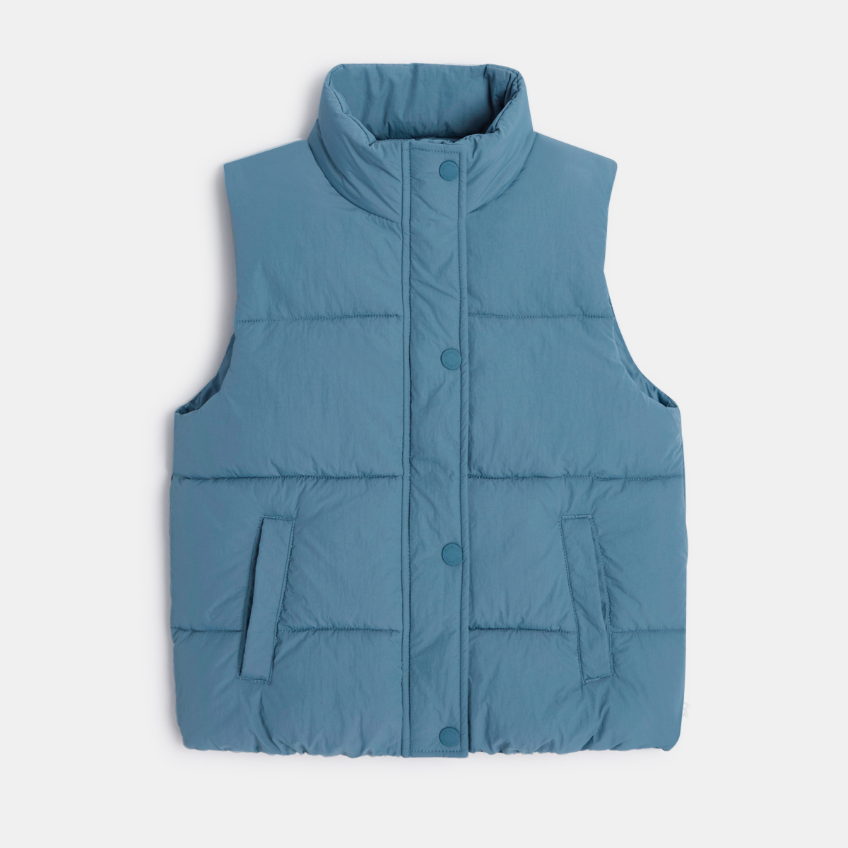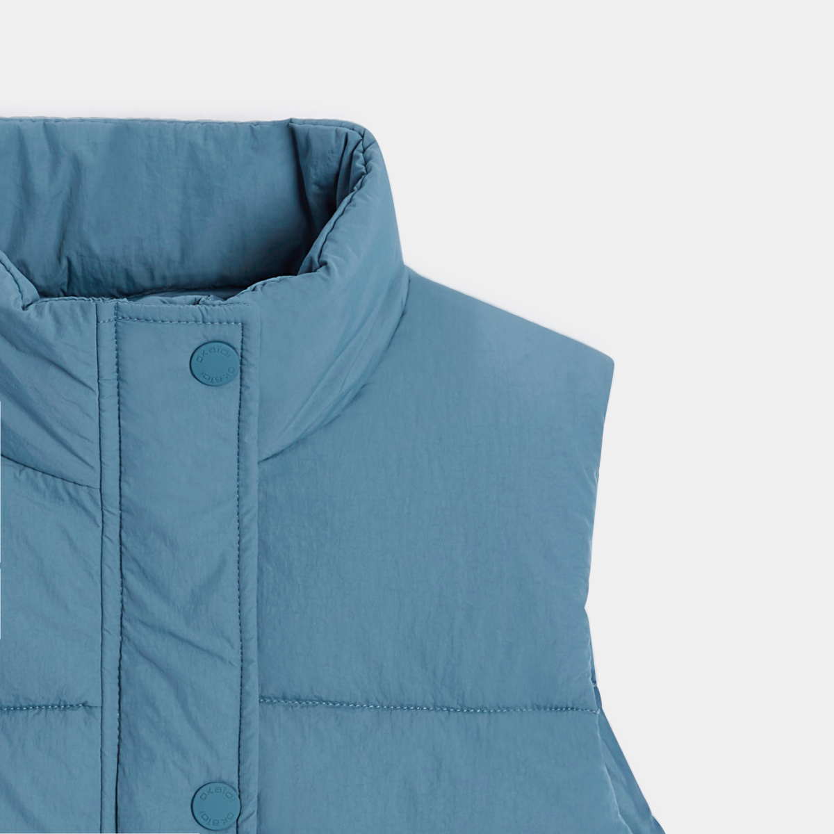 وصفي تُعد من الأساسيات في خزانة ملابس الفتيات، لأن هذه السترة التي هي بدون أكمام يمكن ارتداءها مهما كانت أحوال الطقس : سرعة في ارتداءها، وسرعة في اقفال السحاب ! قماش طارد للماء. قصّة مستقيمة. ياقة عالية. فتحة مزودة بسحّاب مُخبأة أسفل شريط بأزرار كبس. عدد 2 جيب. الحافة السفلية مستقيمة. خياطة بنفس الدرجة اللونية.
