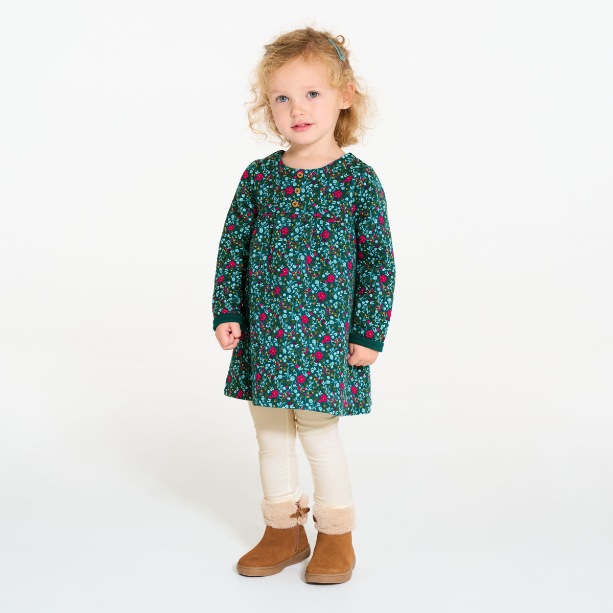 لمسة منمقة في خزانة ملابس الفتيات اللاتي يقدرن الراحة والدفء في هذا الفستان المبطن! يمنحك التصميم حرية الحركة التي تحتاجينها في الأيام النشطة! الغلق بأزرار ضغط على الظهر لكي ترتديه الصغيرات بسهولة. يوفر هذا البنطلون الليجينز القطني المرقط الراحة في الارتداء مع حزام الخصر المسطح المطاطي.