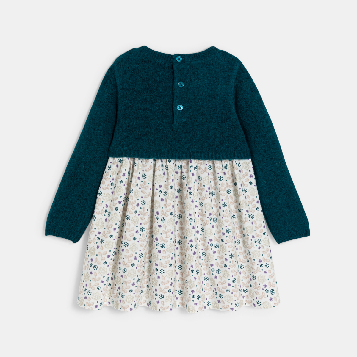 وصفي إنهن يحبن كثيرًا خاصية إثنين في واحد لهذا الفستان الفريد المنسوج من مادتين. بلوزة بأكمام طويلة مصنوعة من نسيج محبوك ناعم ورقيق، والجزء السفلي مصنوع من القطن المزين بالزهور. إغلاق بأزرار من الظهر لإلباس الفتيات الصغيرات بسهولة.