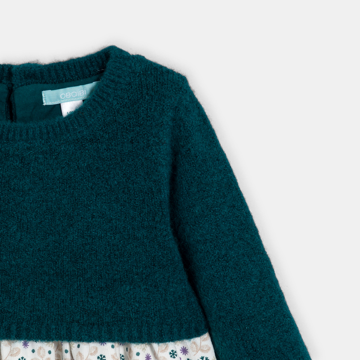 فستان منسوج من مادتين، من الجيرسي والنسج بالدرز باللون الأخضر للفتيات الرضع.