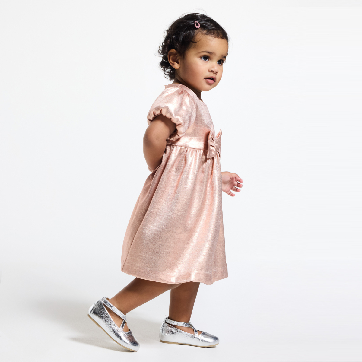 فستان أنيق بربطة خصر ومظهر لامع، باللون الوردي للفتيات الصغيرات