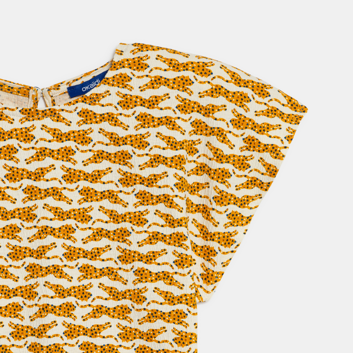 وصفي يحظى هذا الفستان برسمة النمر، الأصلي والمواكب للموضة، برواجا كبيرًا بين الفتيات. جيرسيه منقوش ناعم، وانسيابي. قصّة واسعة تحت الخصر المطاط. حزام شريطي للربط. تقويرة عنق دائرية. أكمام قصيرة واسعة. الحافة السفلية مستديرة. لمسات نهائية بغرزة عُلوية.