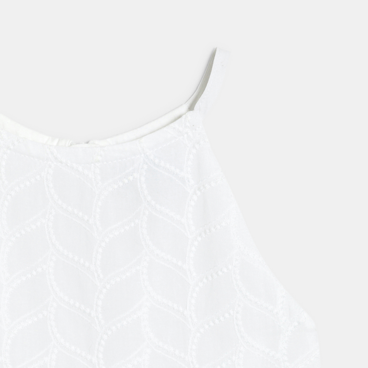 تطريز أصلي باللون الأبيض على النسيج الأبيض على هذا الفستان الأنيق القطني الناعم! تختار الفتيات هذا الفستان الأنيق من القطن الناعم لحضور حفل أو مناسبة أو حفلة صيفية. طوق الياقة. أشرطة كتف رفيعة. فتحات أذرع عالية القطع. قصّة واسعة تحت الخصر المحدد. بطانة من الفوال القطني.