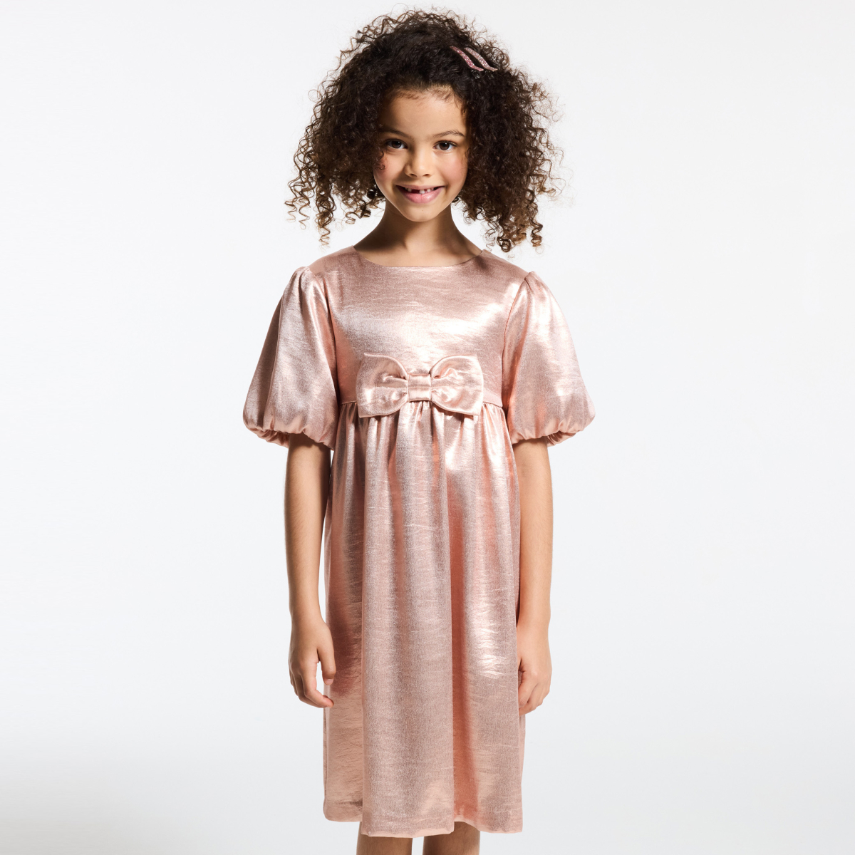 فستان من نسيج كريب اللامع بأكمام منفوخة، باللون الوردي للفتيات