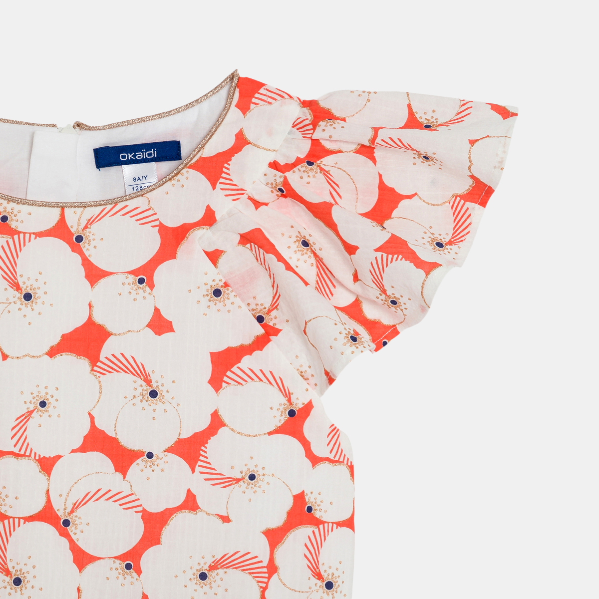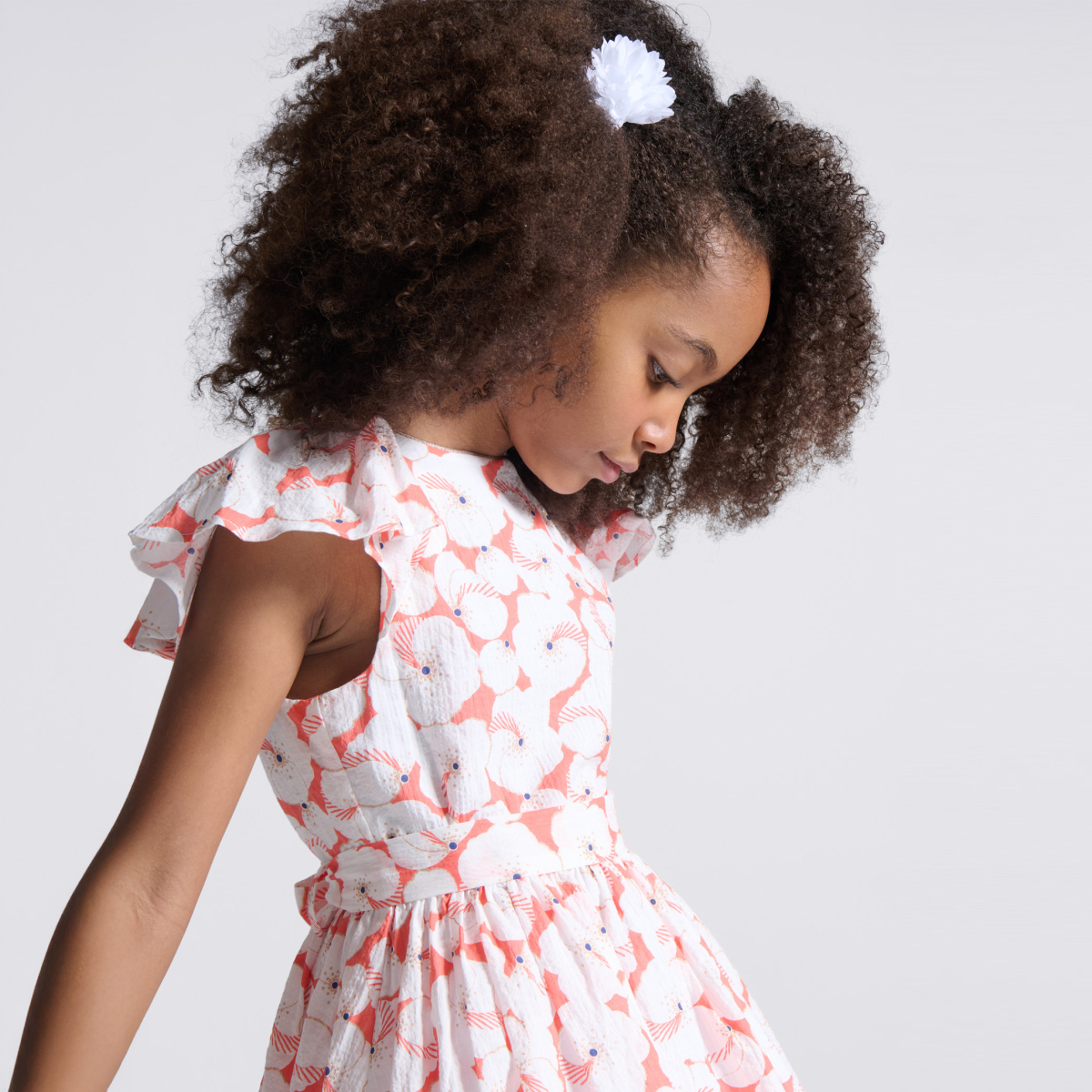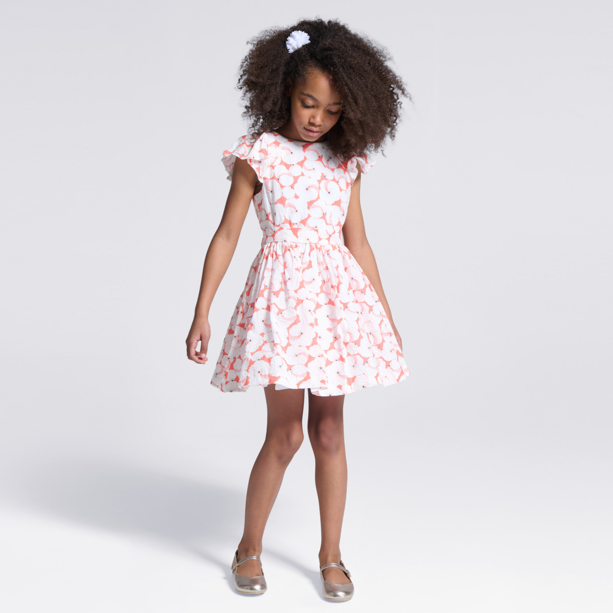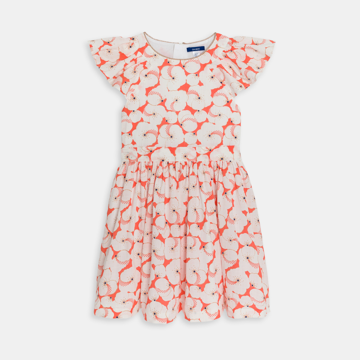 مع هذا الفستان الواسع المزين برسوم الأزهار، تُضفى لمسة من الأناقة على خزانة ملابس الفتيات. نلاحظ وجود بعض النقط قزحية اللون بالقرب من الزهور المطبوعة. مع ياقة مستديرة وشريط زخرفة من الترتر. فتحة بسحًاب مخفية على الظهر، سهل الارتداء. أكمام قصيرة بنمط فراشة. قصّة واسعة تحت الخصر المحدد. الطول أعلى الركبة. بطانة من الفوال القطني.