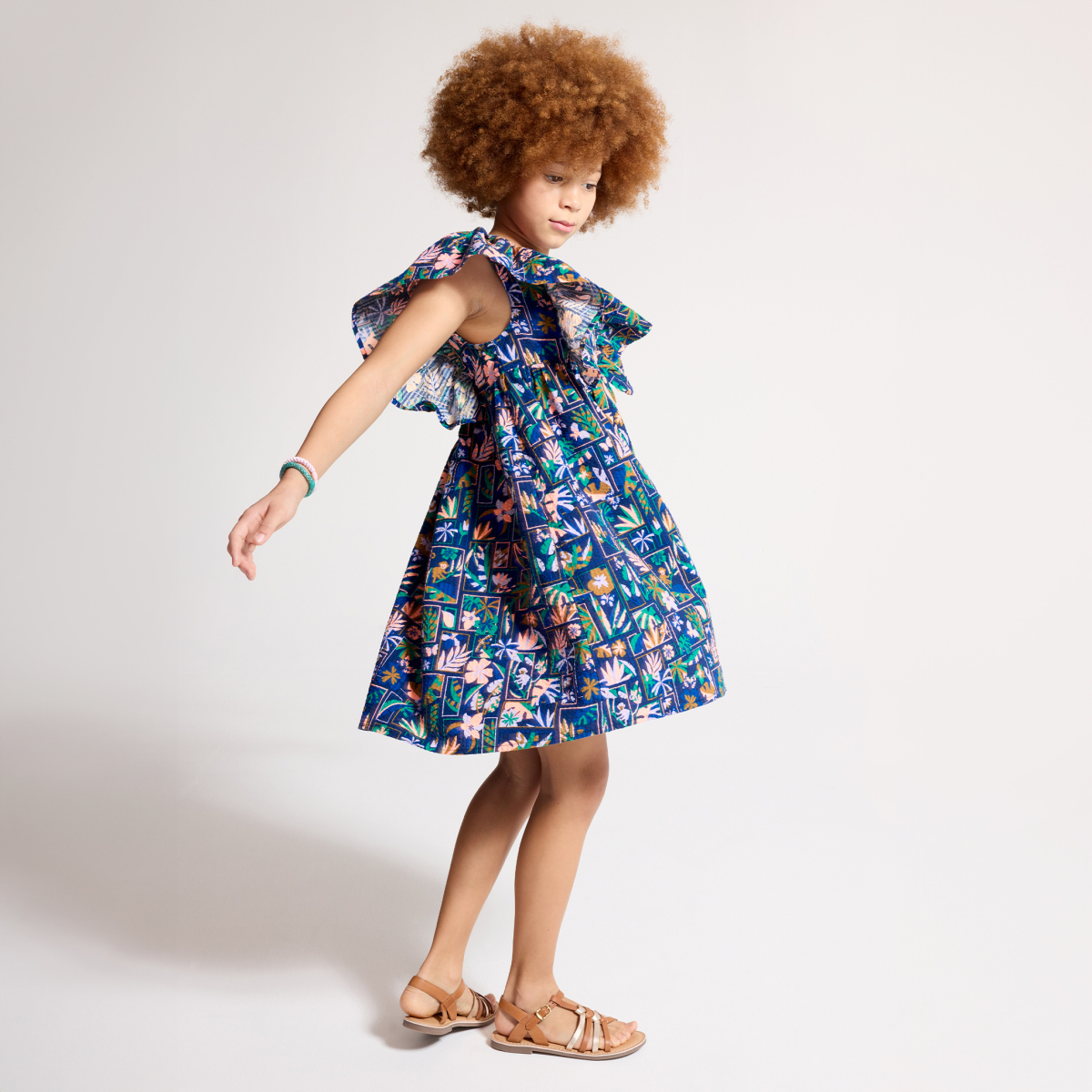 النعومة والخفة والأصالة: الفتيات يسلكن الطريق للصيف مع هذا الفستان القصير المطبوع. قماش ناعم منقوش. نقوش مطبوعة على كامل التصميم. قصة واسعة من الأسفل قليلًا. ياقة مربعة مطرزة من الأمام ومن الظهر. أكمام قصيرة مكشكشة وبها شريط مطاطي على الكتفين. الحافة السفلية مستديرة. لمسات نهائية من نسيج بيكيه. الطول أعلى الركبة.