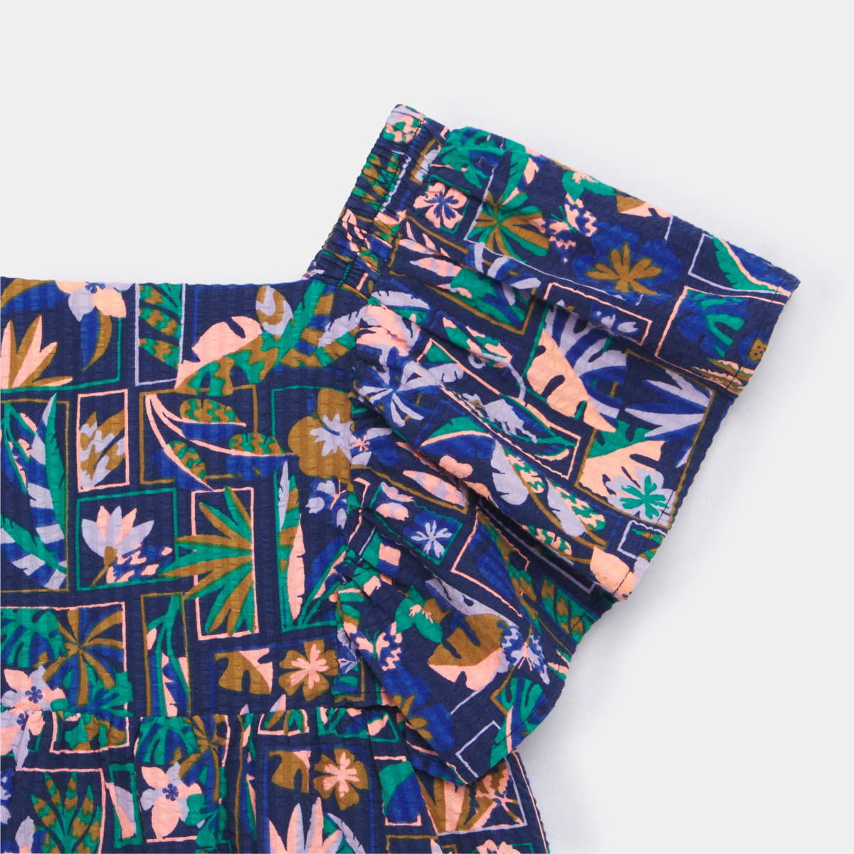 فستان بناتي أزرق مطبوع بأكمام قصيرة مكشكشة