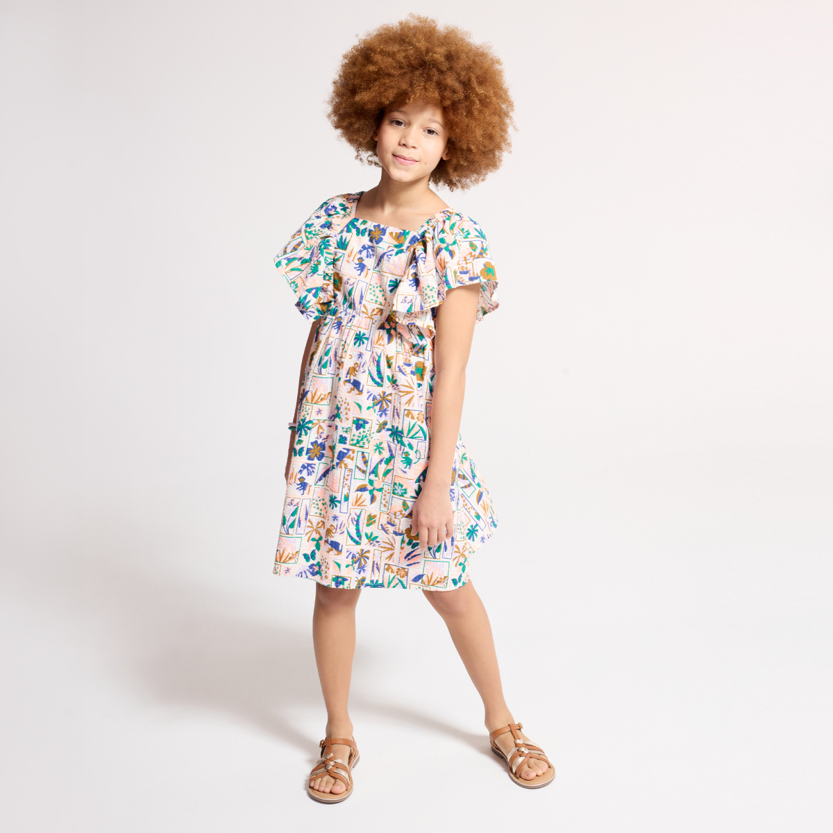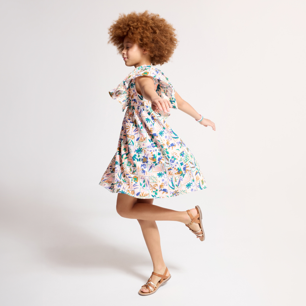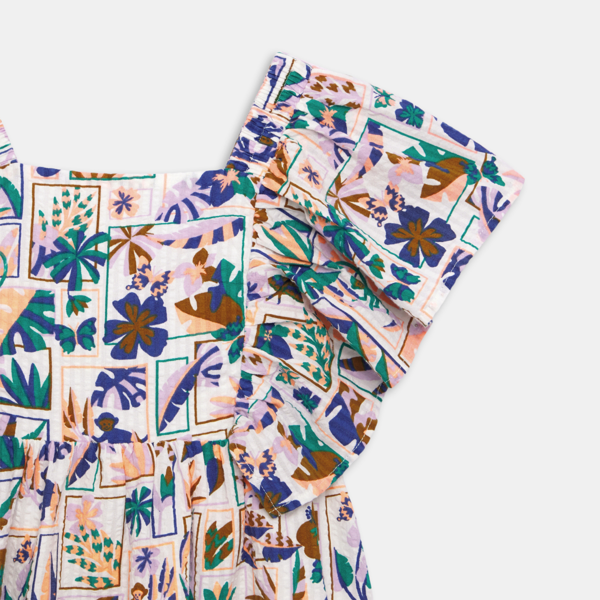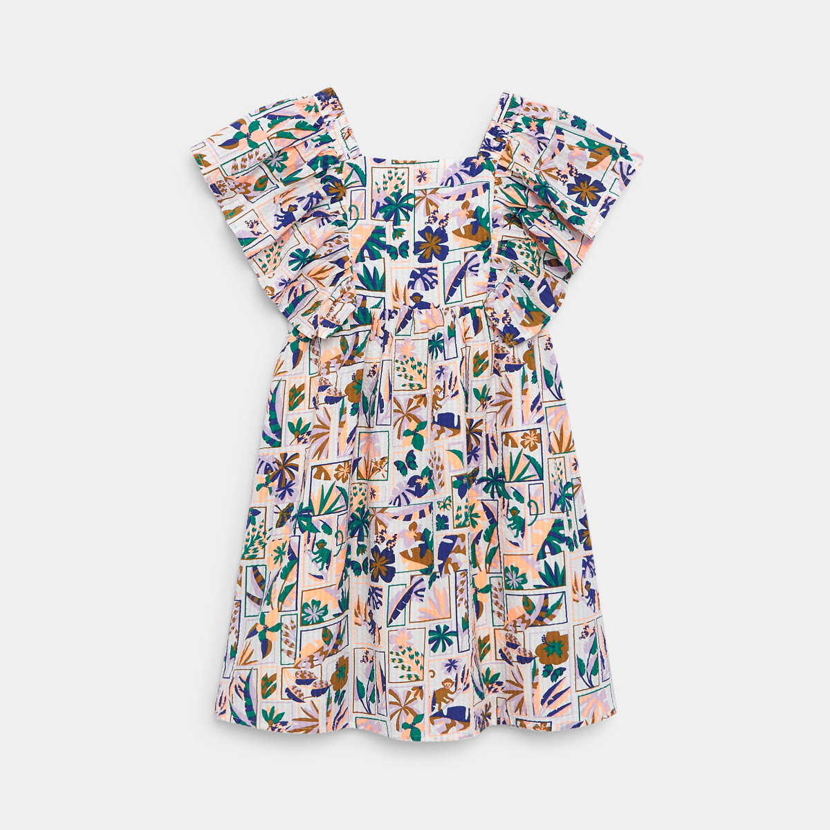 النعومة والخفة والأصالة: الفتيات يسلكن الطريق للصيف مع هذا الفستان القصير المطبوع. قماش ناعم منقوش. نقوش مطبوعة على كامل التصميم. قصة واسعة من الأسفل قليلًا. ياقة مربعة مطرزة من الأمام ومن الخلف. أكمام قصيرة مكشكشة وبها شريط مطاطي على الكتفين. الحافة السفلية مستديرة. لمسات نهائية من نسيج بيكيه. الطول أعلى الركبة.