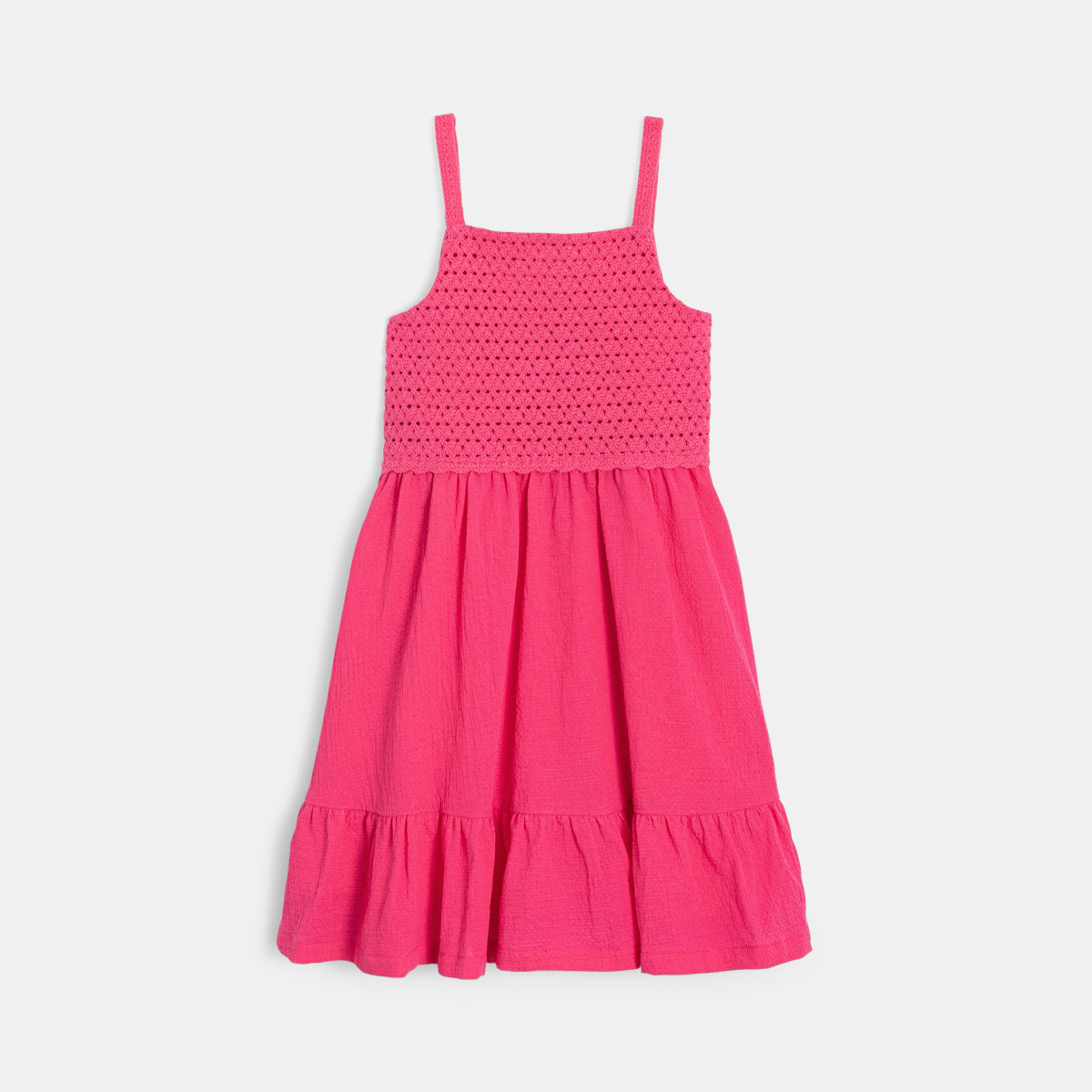 فستان وردي اللون بحمالات وكروشيه بارز وكشكشة للفتيات