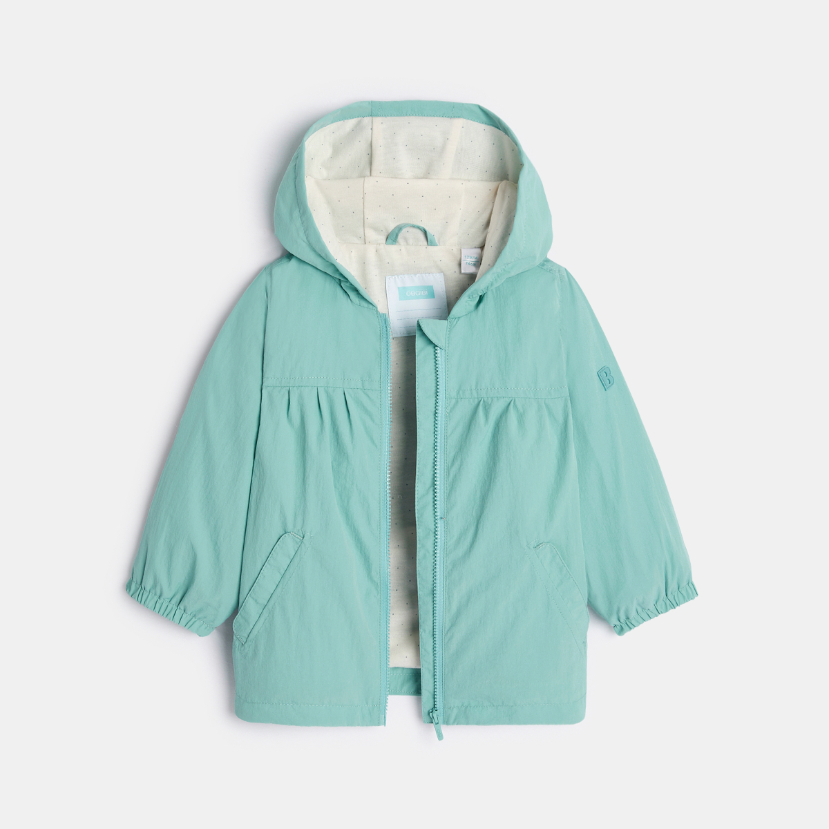 وصفي هذه السترة الخفيفة بغطاء للرأس تحمي الصغيرات من الرياح ومن المطر. قماشها عليه نقش المظلة وناعم. مبطنة بالكامل بالجيرسيه والغلق بسحاب.