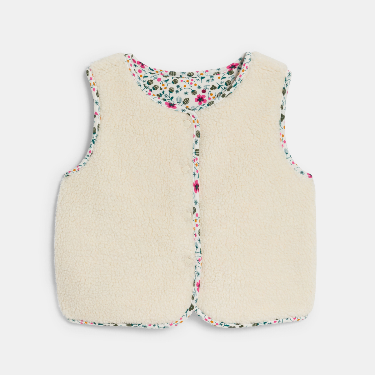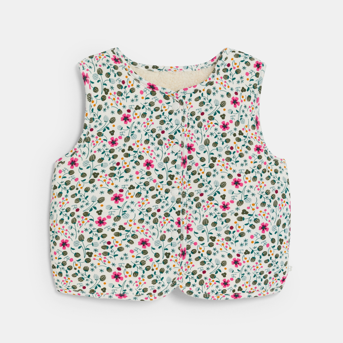 وصفي وجهين لمظهرين مختلفين، ولكن دائمًا مع الكثير من الدفء والنعومة! هذا الجيليه بدون أكمام يناسب جميع ملابس الفتيات. أحد الجوانب من الشيربا الناعم والآخر مزركش برسوم الأزهار.
