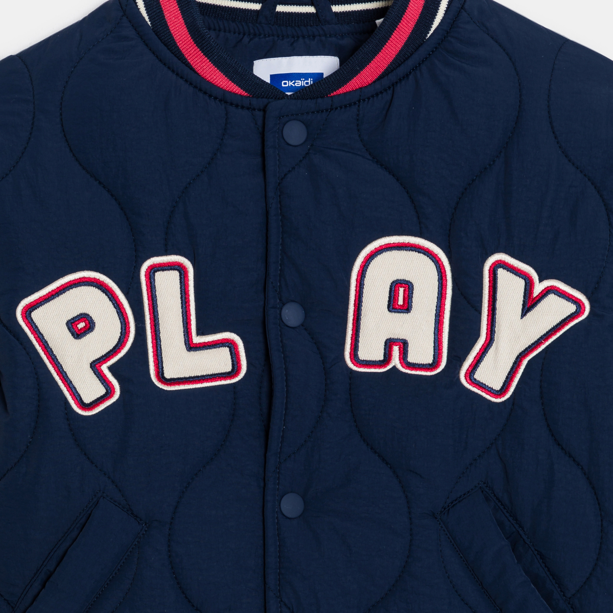 هذه السترة للفتيان ذات اللون الأزرق وبطرازها المنتفخ، تنال إعجاب الكثيرين ! صُممت بقماش الميلتون المُبطن، وتبرُز عليه حروف كلمة "PLAY" المُطرزة. ياقة مستديرة وأكمام طويلة تُعطي مظهرًا رياضيًا. حواف مُضلعة وملونة عند أساور الأكمام وعند حافَة السترة، تُعطي مظهرًا عصريًا وعلى الموضة. الإقفال بأزرار كبس. مثالية للارتداء في الحياة اليومية، فهي سهلة في الارتداء ومريحة.