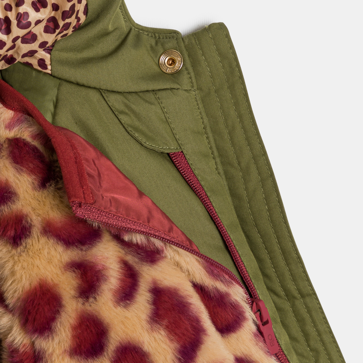 سترة ببطانة سترة قابلة للفصل، اللون أخضر كاكي، عليها صورة فهد، للطفلة الصغيرة