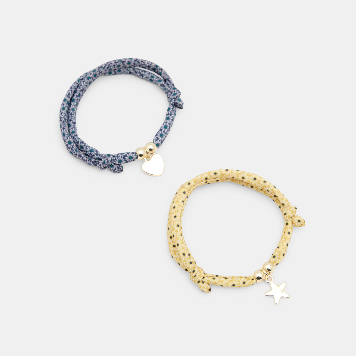حققت أنماط الأزهار اليابانية الصغيرة نجاحًا كبيرًا من خلال هاذين السوارين، المُلحق بهما حُلي معدنية وفضية اللون. عقدة منزلقة يمكن ضبطها بسهولة حول المعصم. مقاس موحّد. فكرة جيدة للهدايا.