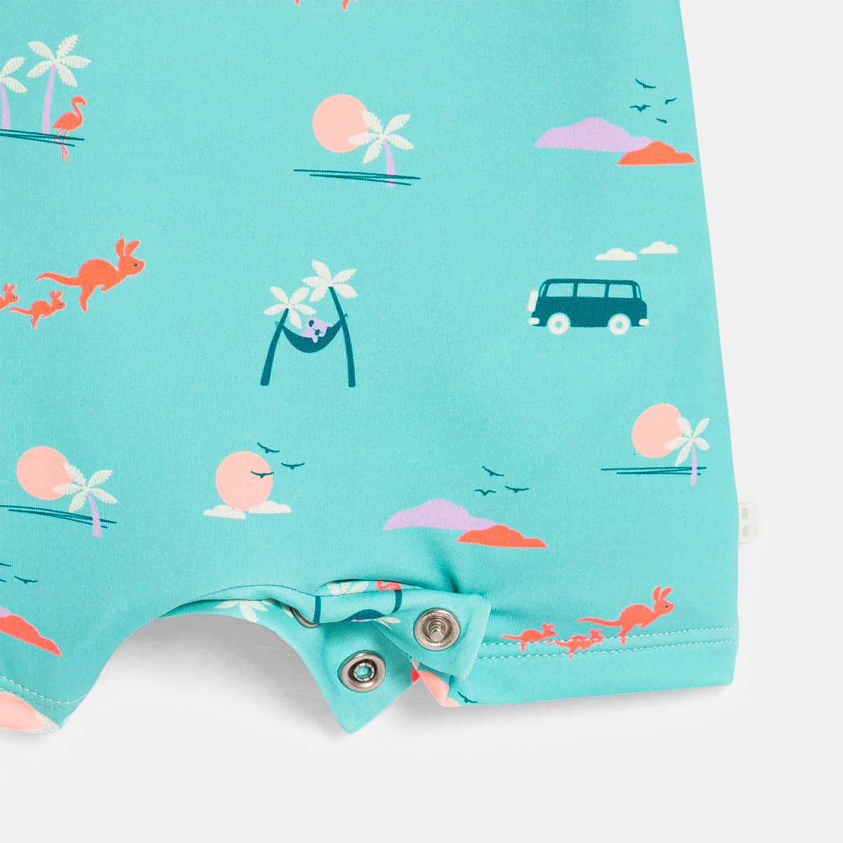 وصفي تحمي هذه البدلة القصيرة ذات الأكمام الطويلة بشرة الصغار الحساسة، أثناء العطلات، من الأشعة فوق البنفسجية فئة A والأشعة فوق البنفسجية فئة B. تتميز بطبعة نابضة بالحيوية، مستوحاة من السفر، والتي تحوذ على إعجاب الأولاد الصغار. الإغلاق بسحاب في الخلف لسهولة الارتداء.