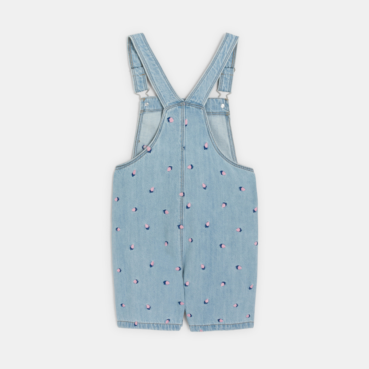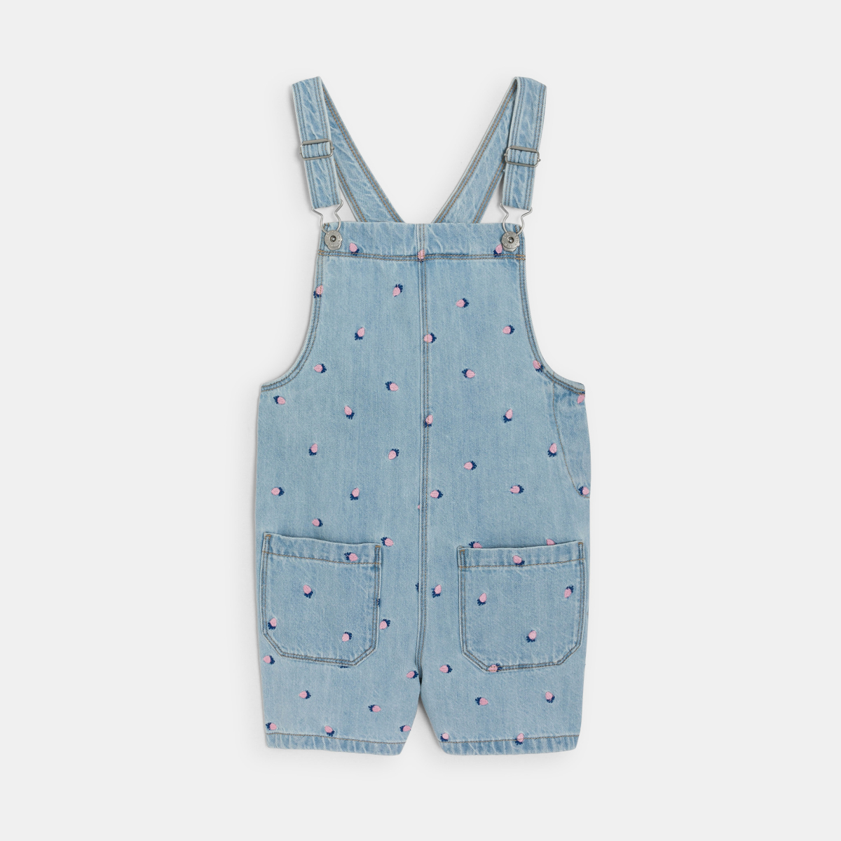 من الجينز المُبيَّض وبنقوش صغيرة مُطرزة : بدلة سالوبيت قصيرة طراز شورت، إحدى القطع المُفضلة لدى الفتيات في هذا الموسم ! تفصيل فضفاض قليلًا يُعطي مظهرًا عصريًا وعلى الموضة. حمّالات قابلة للتعديل مع مشبك معدني. جيبان أماميان.بارزان خياطة من اللون ذاته.
