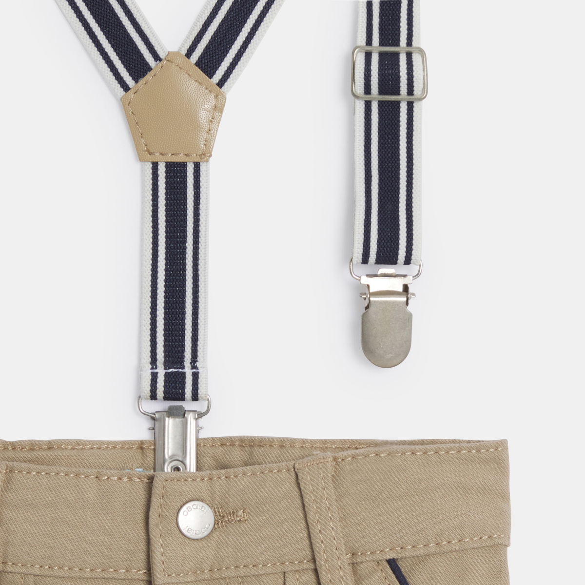 وصفي للفتيان الصغار المرحين والذين يحبون الحركة طوال اليوم، فإن هذا البنطلون (السروال) بالحمالات والمصنوع من قطن مرن، يضفي لمسة غنية بالألوان على الزي. بطرازه الطويل أو القصير، فإن أرجل هذا البنطلون (السروال) قابلة للطي بفضل وجود أزرار بالكبس والأربطة. من القطن الفاخر. حمّالات مطاطية ومُخططة، قابلة للإزالة بواسطة مشابك. حزام قابل للتعديل باستخدام أزرار.