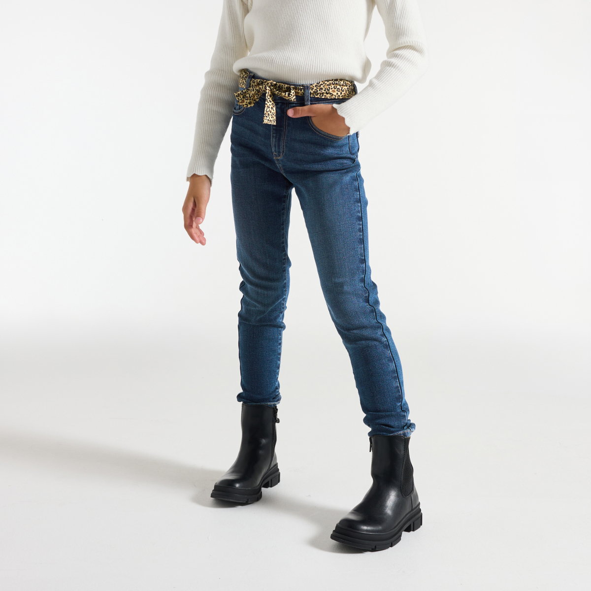 جميع الفتيات يرغبن في الحصول على بنطلون بقصة سكيني ! يمكن ارتداؤه مع أو بدون حزام لربطه دنيم ناعم ومرن بتأثير باهت على بعض الأجزاء مما يجعله سببًا في بهجة الفتيات! قصّة سكيني ضيقة. حلقات للحزام. حزام برسوم مطبوعة (قابل للإزالة). الفتح بزر مسمار وسحّاب. محيط الخصر قابل للضبط. 5 جيوب. لمسات نهائية بغرزة عُلوية.