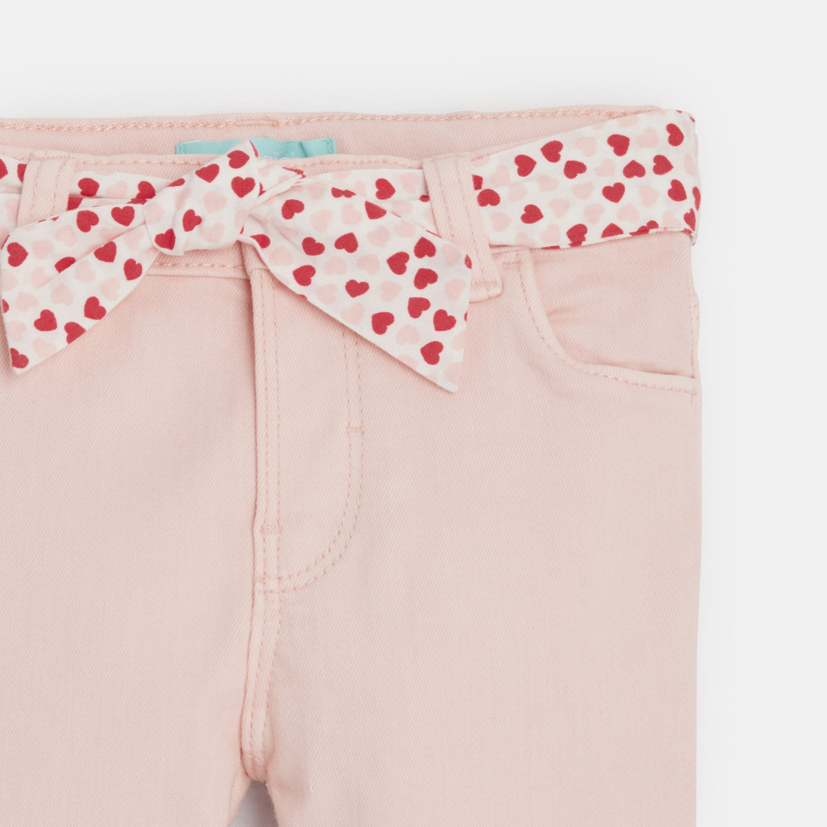 وصفي مصنوع من القطن المطاطي المريح، هذا البنطلون يضفي لمسة ملونة وناعمة على خزانة ملابس الفتيات. بفضل حزامه المتباين المطبوع بقلوب صغيرة لإضفاء لمسة جذابة، يعد هذا البنطلون مثاليًا للأيام النشطة.