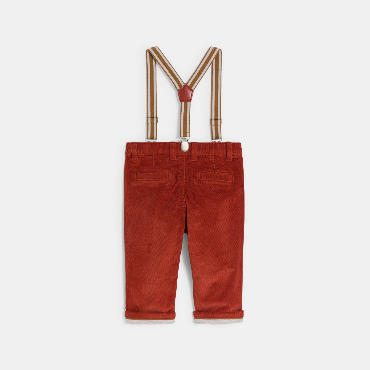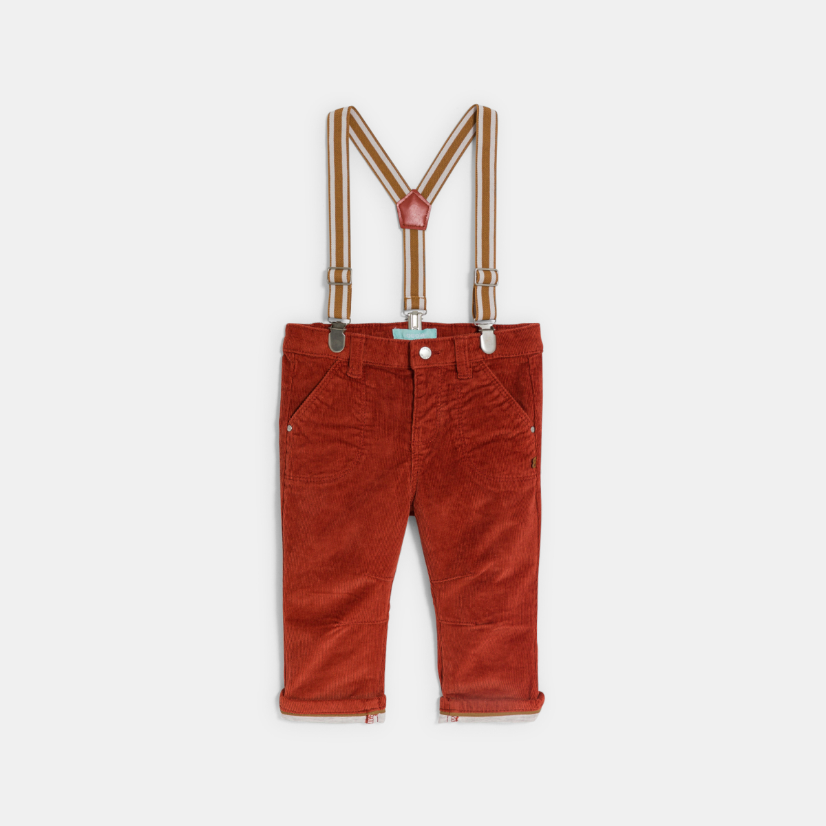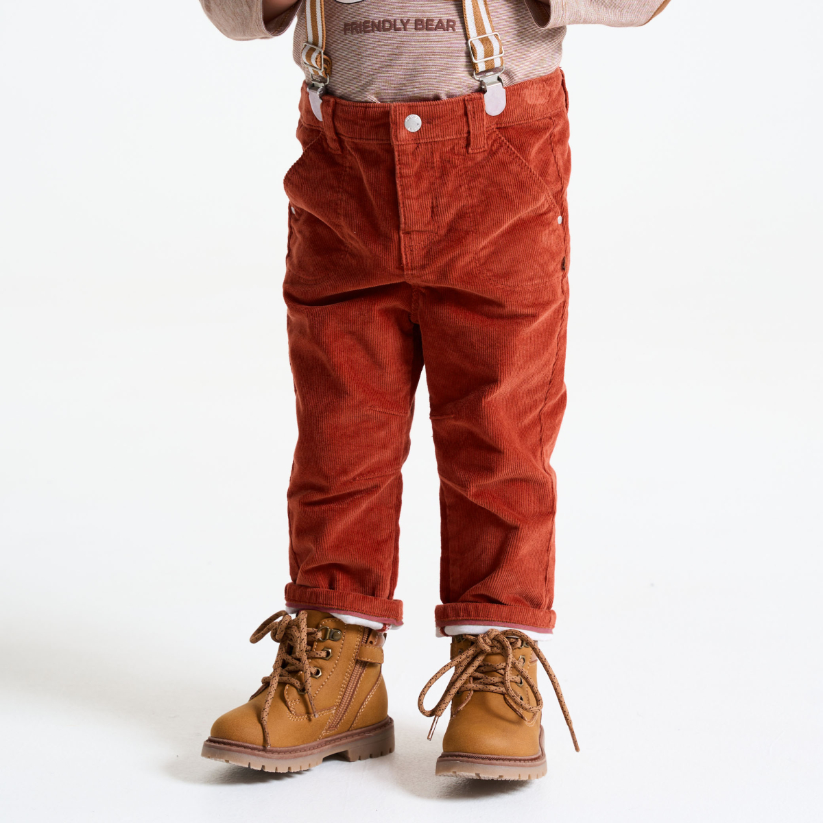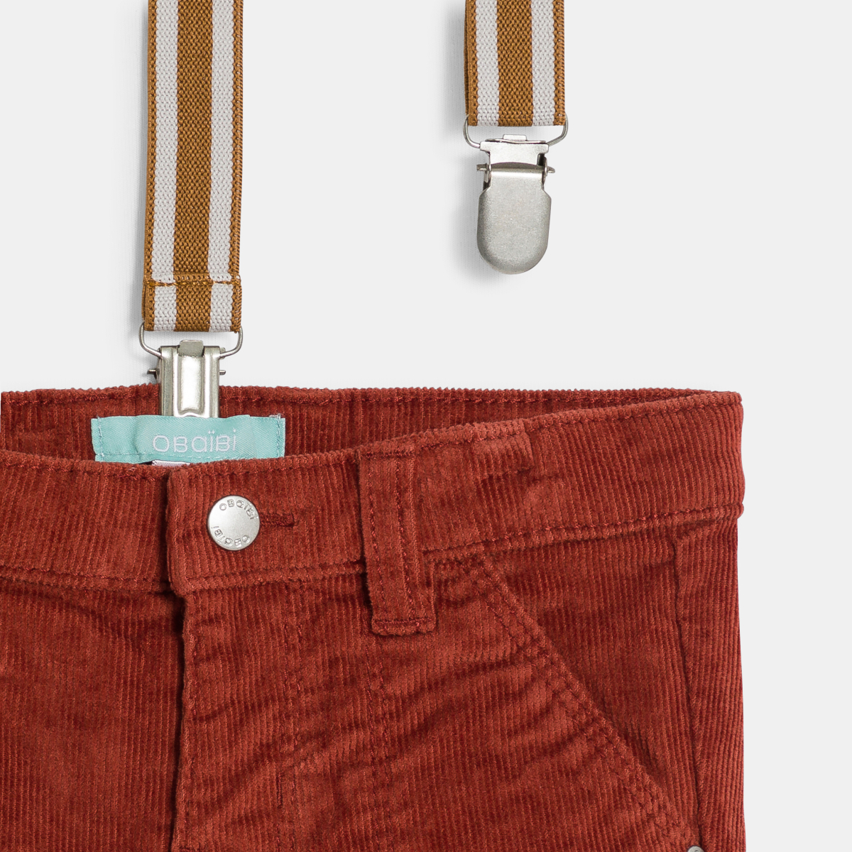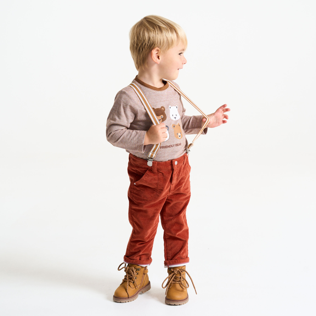 أسلوب أصلي لهذا البنطال المخملي المضلع. يدفىء أرجل الأولاد ويمكن ارتداؤه بحمالات أو بدونها. حزام قابل للتعديل مطعم بأزرار.