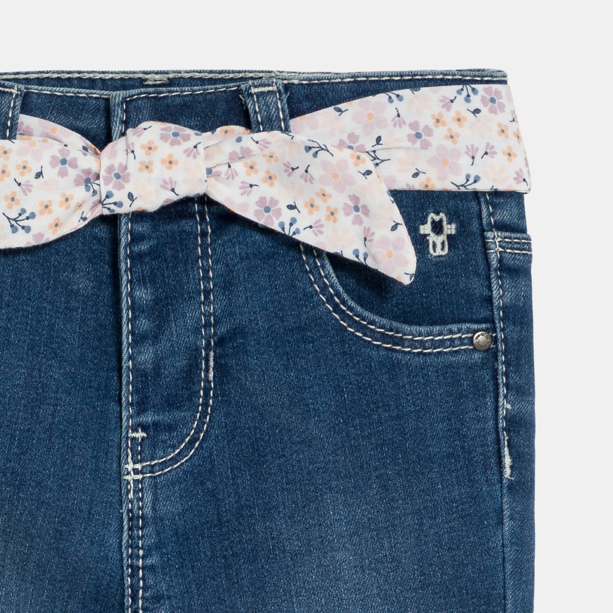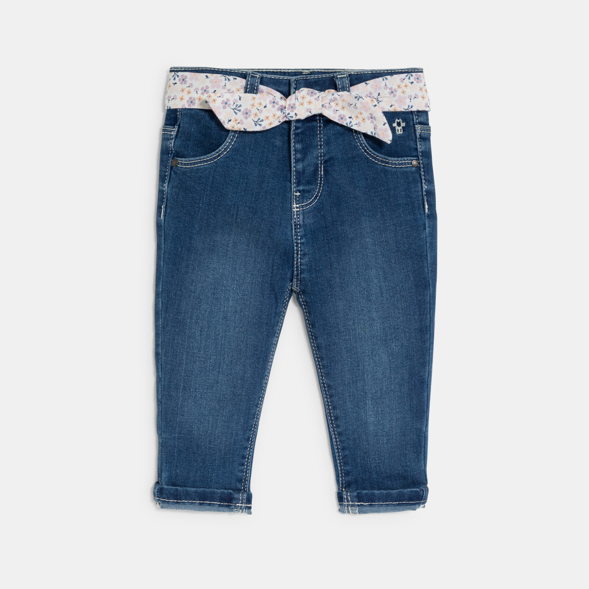 بنطال جينز بقصة عادية مع حزام مزين برسوم أزهار، باللون الأزرق للفتيات الرضع.