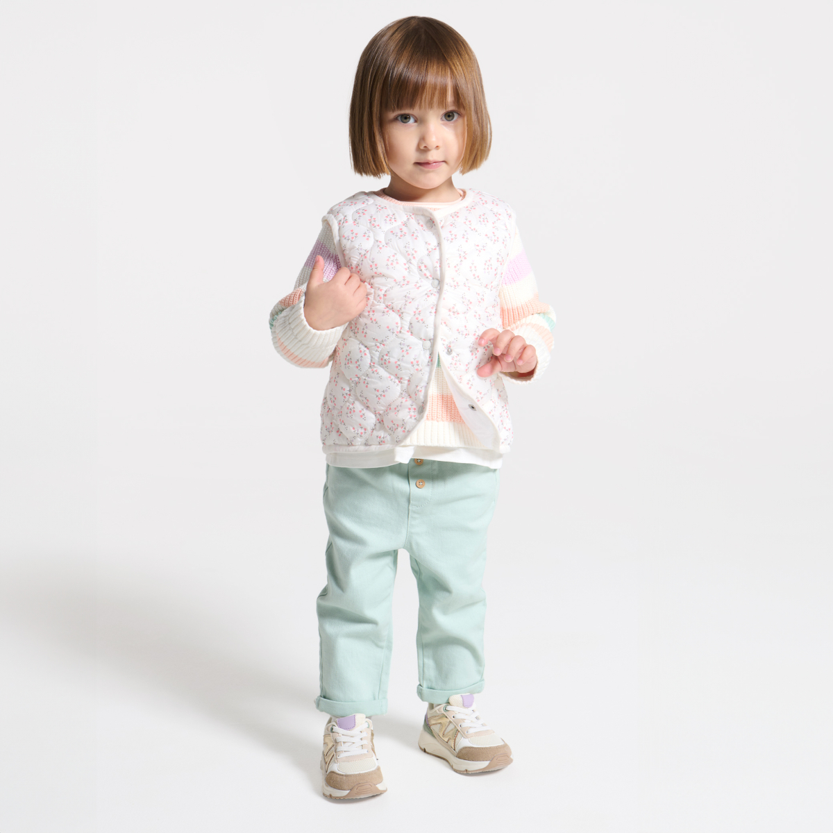 بنطال أنيق، قطعة أساسية في خزانة ملابس الفتيات. تصميم مريح، يسهل تنسيقه مع جميع أنواع الملابس وفي كل المواسم، ويتميز بخصر عالٍ وحزام مطبوع قابل للإزالة.