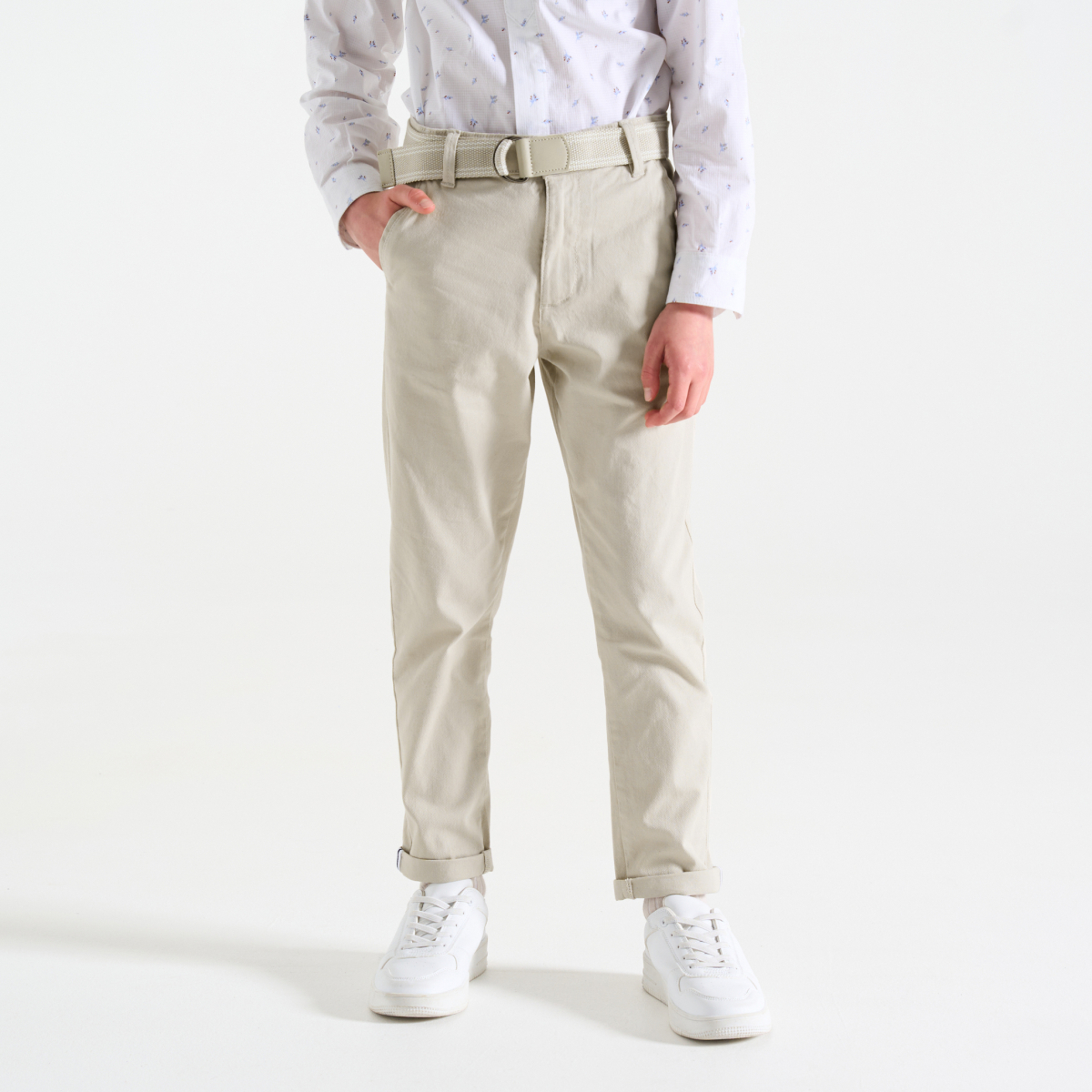 يعتبر بنطلون شينو دائمًا خيارًا جيدًا لإضفاء مظهر رائع و/أو أنيق على الأطفال. سهل التنسيق. قَصّة ضيقة. قماش ناعم. حلقات للحزام. محيط الخصر قابل للضبط. حزام بحلقة قابل للتعديل والإزالة. جيبان. طية قابلة للتعديل. لمسات نهائية من نسيج بيكيه.