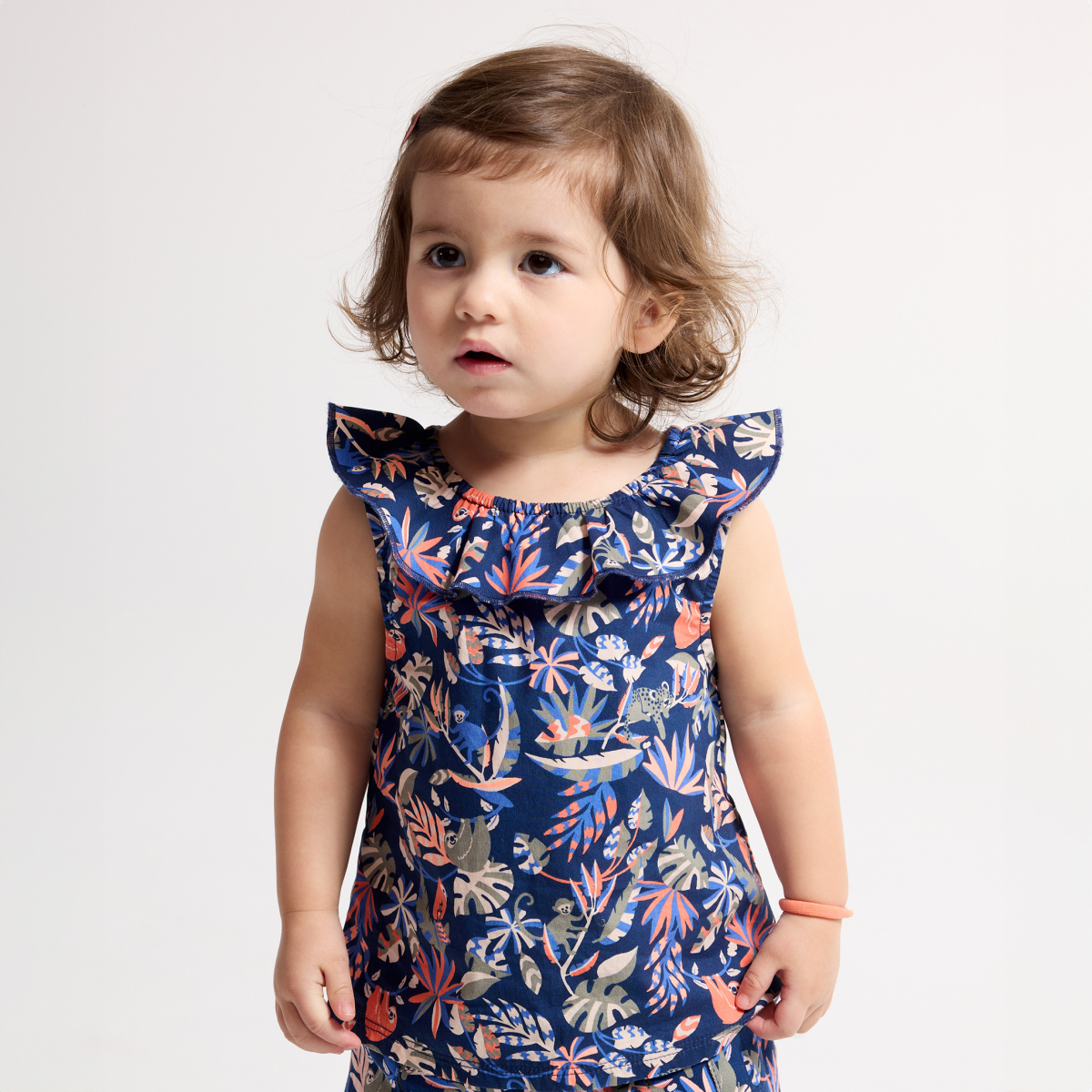وصفي لمسة من الغابة في خزانة ملابس كل فتاة! مع هذه البلوزة بدون أكمام ستشعر الصغيرة بالراحة بمجرد قدوم الأيام المشمسة. يمكن تنسيقه مع شورت جينز ناعم وخفيف من الدنيم فهو الزي المثالي للطقس الدافئ. بلوزة بياقة مطاطية لسهولة الارتداء وشورت بحزام خصر مطاطي وحزام مطبوع عليه.