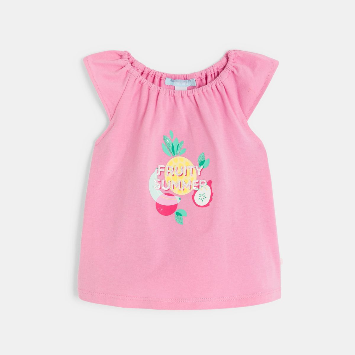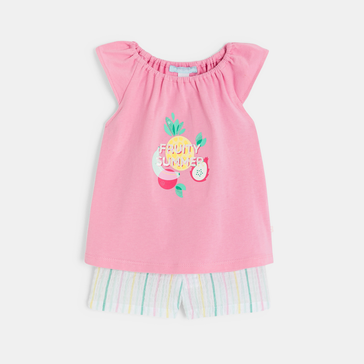 تيشيرت بياقة مطاطية مطبوع عليه صورة فاكهة وشورت مخطط باللون الوردي للفتاة الرضيعة
