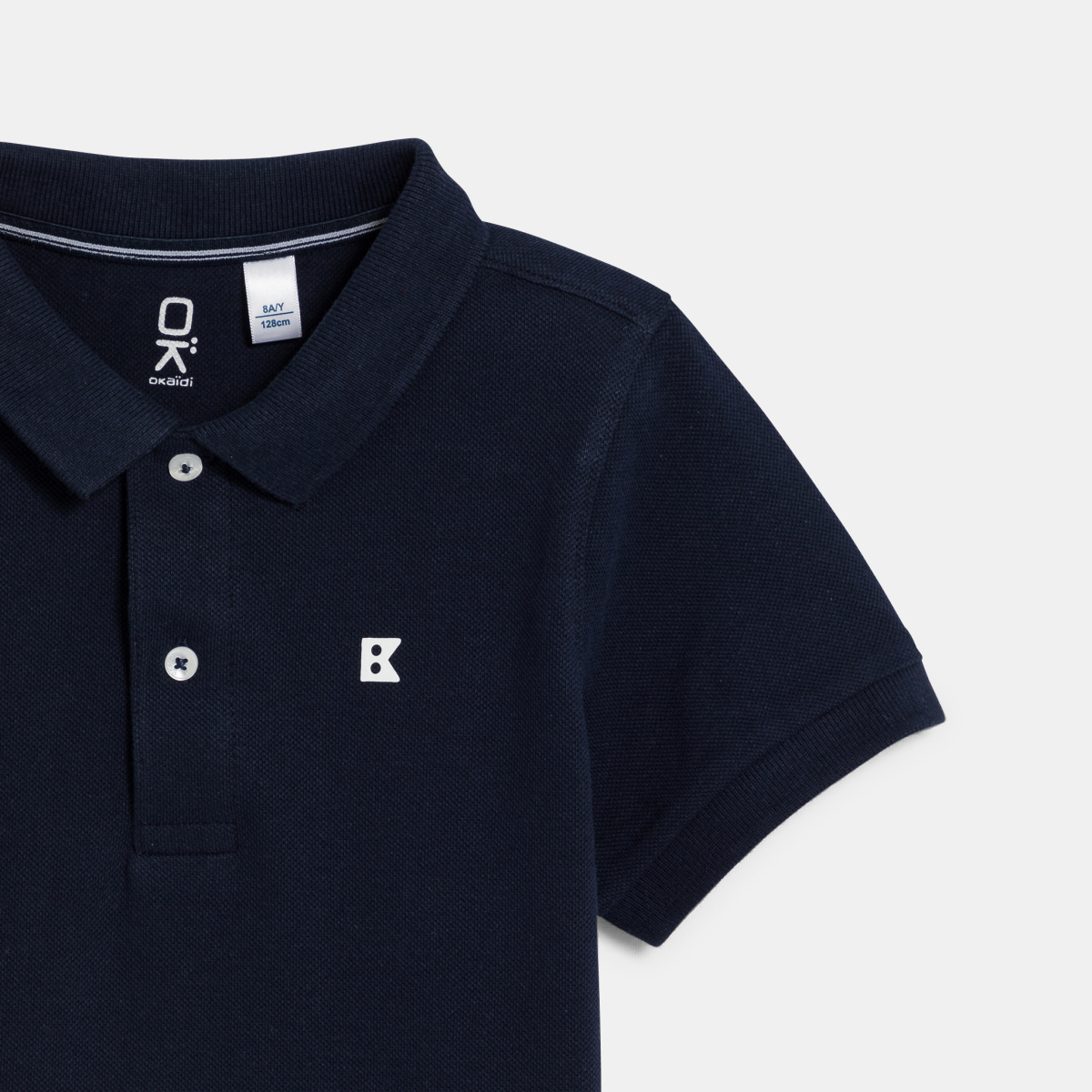 وصفي تي شيرت / قميص بولو ولادي. جيرسي من قطن البيكيه، قابل للمط قليلاً. قصًة مستقيمة. ياقة بولو مع طيًات مضلعة، شريط بأزرار أمامية، سهلة الارتداء. لمسات نهائية مائلة داخل تقويرة العنق. شعار أوكايدي بحبر بارز على الصدر. أكمام قصيرة، حواف مضلعة. قصًة مستقيمة أطول قليلًا على الظهر. فتحات من الجنب. خياطة بنفس اللون.