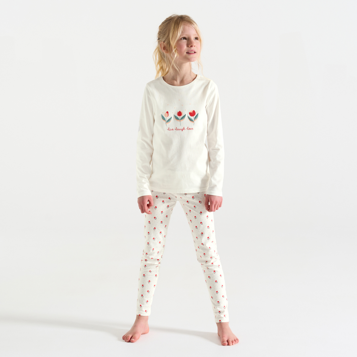 وصفي مع رسوم ورود التوليب للاحتفاء بالطبيعة، حتى في الليل! هذه البيجاما من الجيرسي المزين برسوم، مكونة من قطعتين: جزء علوي برسوم مطبوعة من الأمام (بقصة مستقيمة وياقة مستديرة وأكمام طويلة ) وبنطلون على شكل طماق مزين برسوم( خصر مرن).