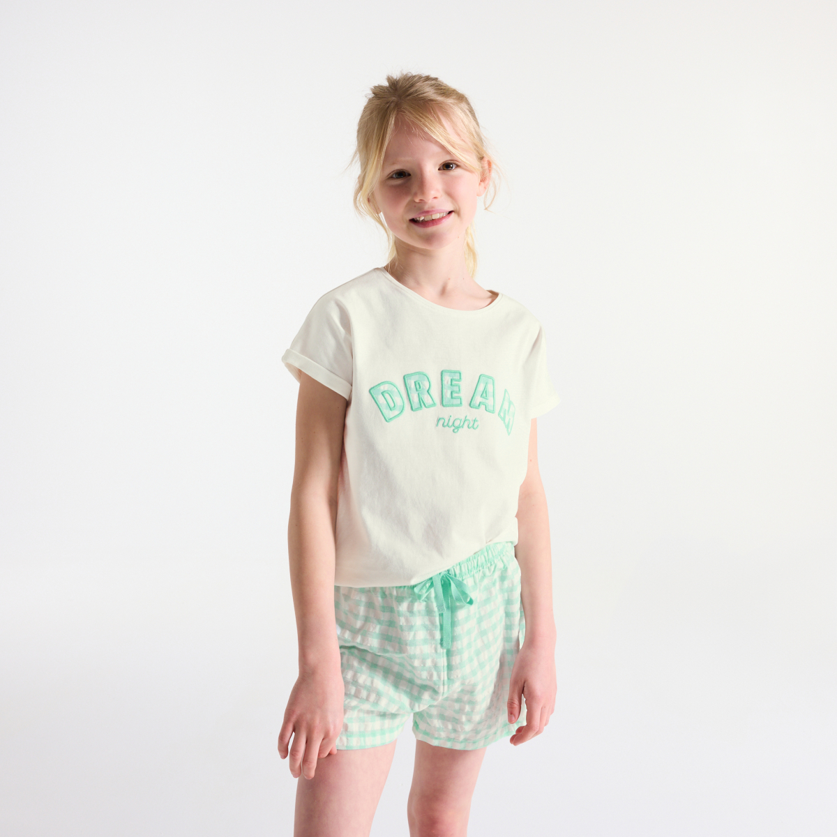 وصفي النعومة ومربعات قطن فيشي في برنامج السهرة الصيفية للفتيات. تتكون هذه البيجامة من قطعتين: تيشيرت من الجيرسيه مع كلمات موضوعة من الأمام (قصّة مستقيمة وياقة مستديرة وأكمام قصيرة) وشورت من قماش مربعات مطبوع عليه (خصر مطاطي).