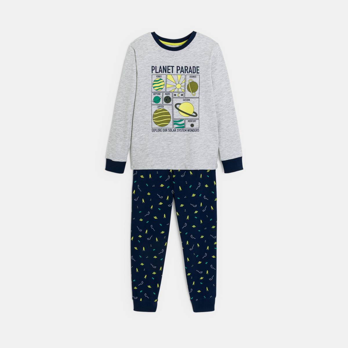 وصفي تعرفوا على هذه البيجاما رمادية اللون للصبيان، في مجالات واسعة ! حيث نجد بالجزء العلوي ياقة مستديرة وأكمام طويلة، ويُبرز فيه رسمة مُضحكة لنظام المجموعة الشمسية. بالجزء السفلي المصنوع من جيرسيه ناعم، ومطبوعات عن عناصر ملونة موجودة بحجم كبير . مثالية لقضاء ليالٍ استكشافية دافئة. خصر مطاطي مرن لتسهيل ارتداءها والحصول على راحة قصوى. مثالية للذهاب في مغامرة ليلية رائعة مع النجوم!