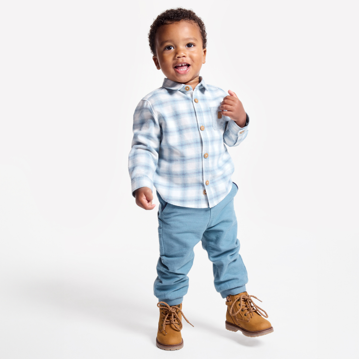 نحب القطن الناعم الذي يدفئ الأطفال ويضفي لمسة أصلية على خزانة ملابسهم بفضل نسيج المربعات. أكمام طويلة بأزرار.