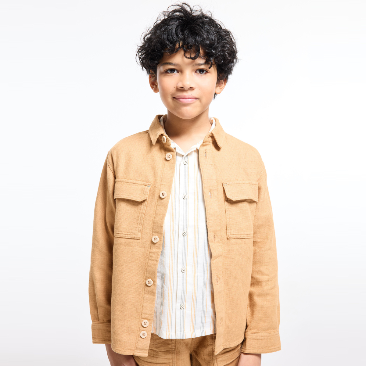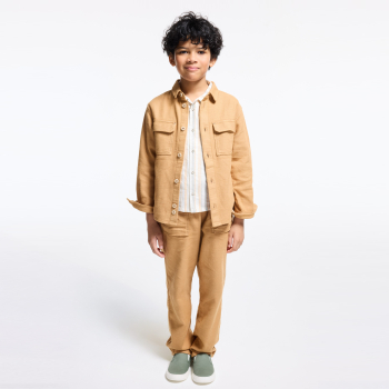قميص أو قميص فوقي، يجب تشجيع كلا الخيارين لتنويع إطلالات الأولاد! قصّة مستقيمة. ياقة قميص كلاسيكية. الفتح بأزرار. 2 جيوب في الصدر برفرف. أكمام طويلة وأساور بأزرار. الحافة السفلية مستديرة. خياطة من اللون ذاته.