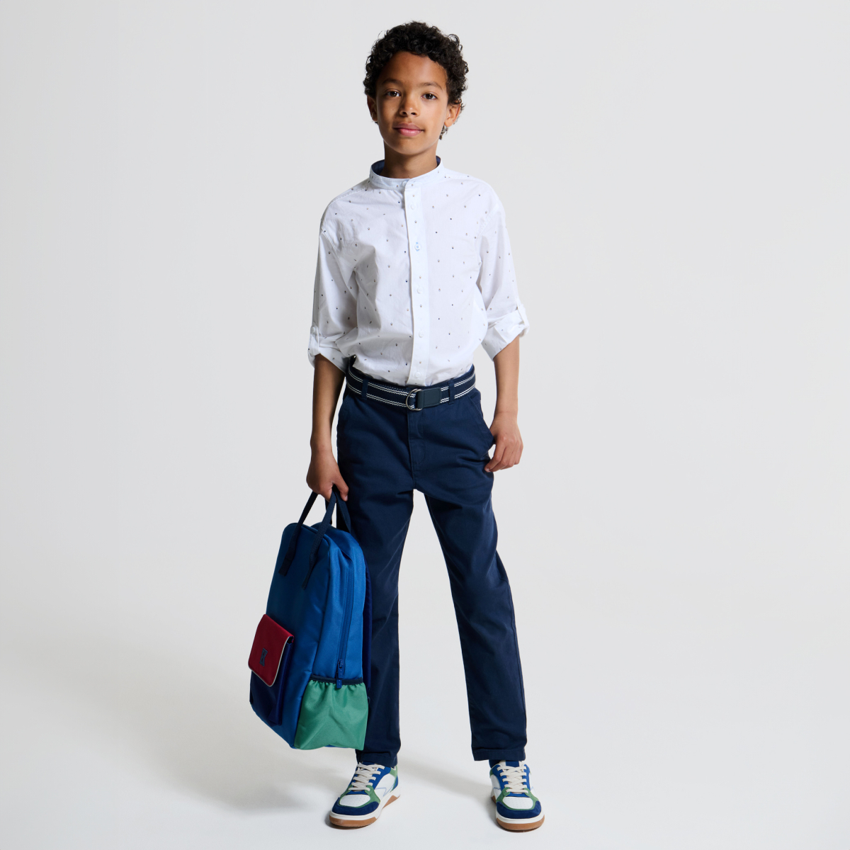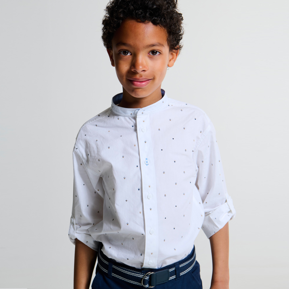 قطعة كلاسيكية أساسية في خزانة ملابس الأولاد. نحن نركز على النقوش المطبوعة الصغيرة. بوبلين قطني ناعم. قصّة مستقيمة. ياقة قميص كلاسيكية. أكمام طويلة قابلة للطي بواسطة عروة مع زر. معاصم الأكمام بأزرار. لمسات نهائية من نسيج بيكيه.