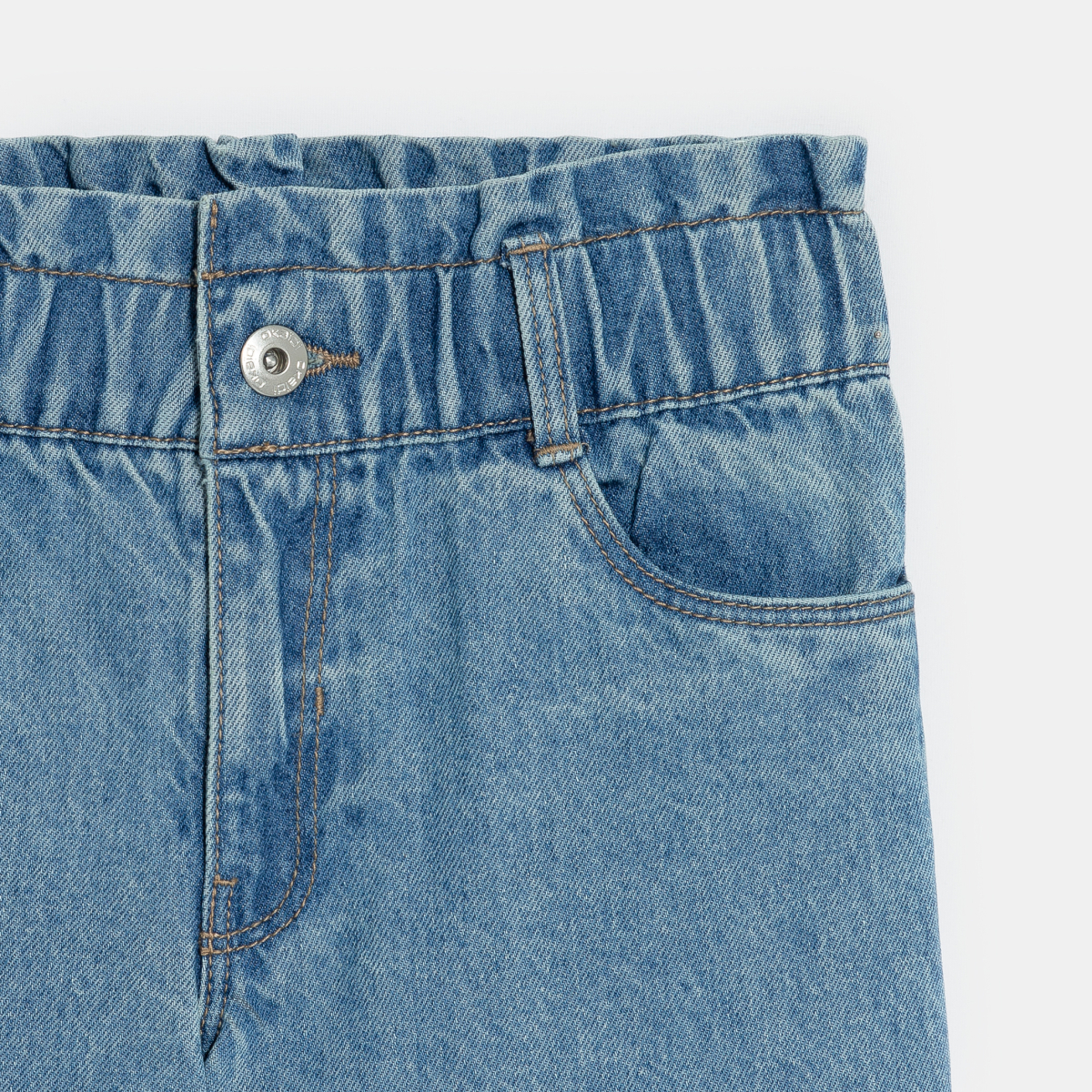 تصميم بخصر مطاطي مكشكش مصنوع من قماش الدينم المغسول المميز والمريح: شورت برمودا من الدنيم مناسب للارتداء طوال الموسم، مع حذاء رياضي أوحذاء باليرينا أو حتى حافي القدمين! حلقات للحزام. فتحة أمامية بأزرار. الطول فوق الركبة.