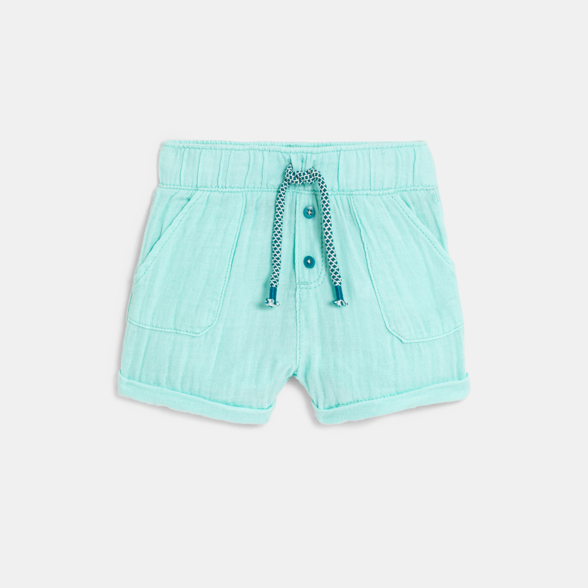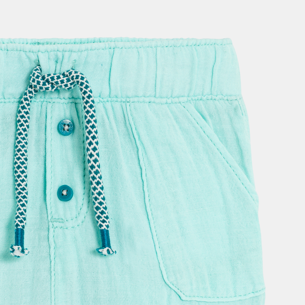 يتمتع الأولاد بالتحرك بحرية تامة في هذا الشورت المصنوع من قماش الشاش القطني المنقوش. خصر مطااطي مريح للغاية وقابل للتعديل، مزود بزر ورباط شد فاخر.