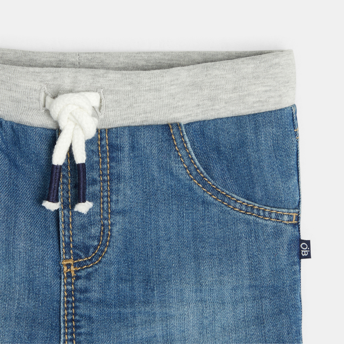 شورت جينز بي بي ولادي. قماش جينز دنيم مع ألياف قطنية من الزراعة العضوية،Act for Kids. موديل 4 جيوب. خصر مطاطي مع حرف كوت مريح قابل للتعديل من خلال مطاط داخلي مع رباط للعقد. طية مردودة حرة في الجزء السفلي من الساق. درزات بلون مغاير. لصاقة عليها ماركة أوبي بي.