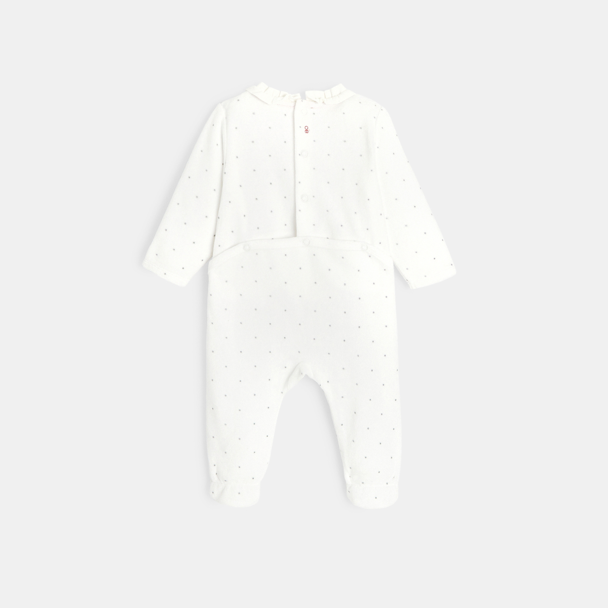 حب فتاة صغيرة في بدلة نوم راقية. بيجامة من قطعة واحدة من المخمل الناعم، ومطبوعة بنقاط بولكا قزحية اللون. ياقة مكشكشة وتطريز ثلاثي الأبعاد. إغلاق بالإطباق في الخلف.