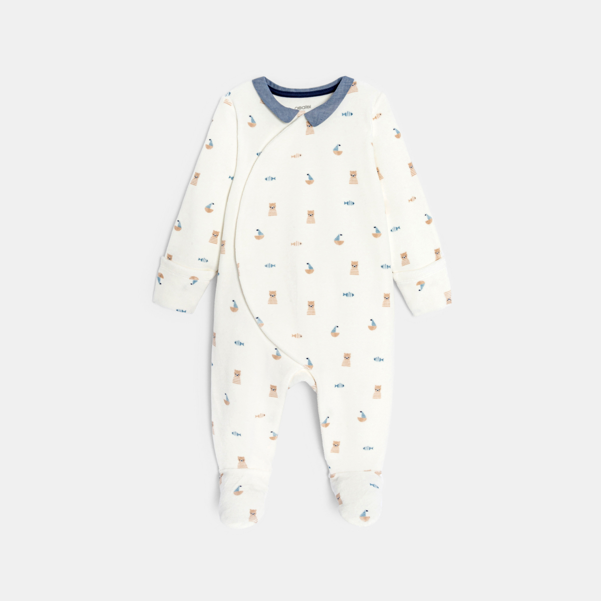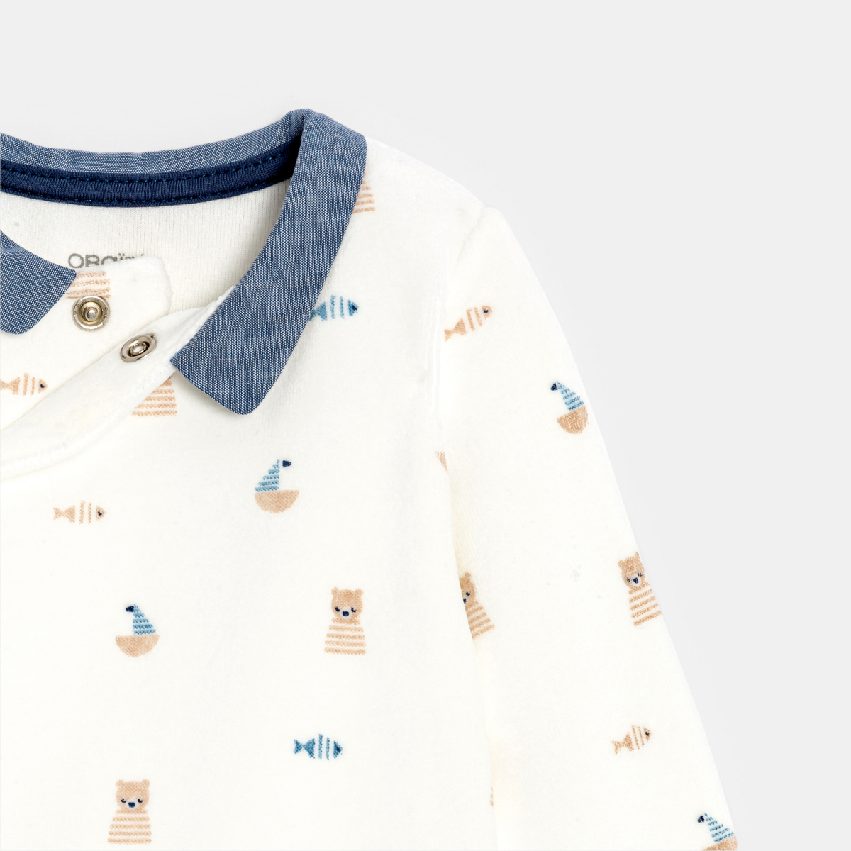 وصفي بيجامة مكونة من قطعة واحدة تجعل الصغار ينعمون بلمسة من الدفئ والنعومة في لياليهم الباردة، فهي قطعة أساسية في خزانة ملابس الأطفال الصغار. مزينة برسومات على شكل دب وقوارب وأسماك، مع ياقة صغيرة بلون مختلف. الفتح بأزرار كبس من الأمام لسهولة الارتداء ورضيعكِ يرقد على ظهره.