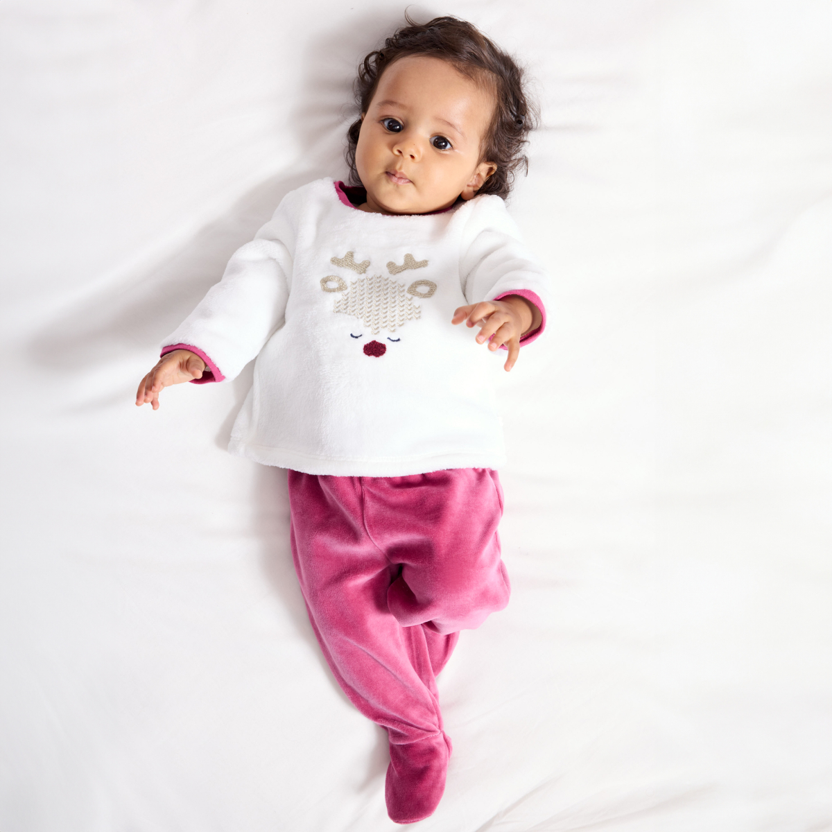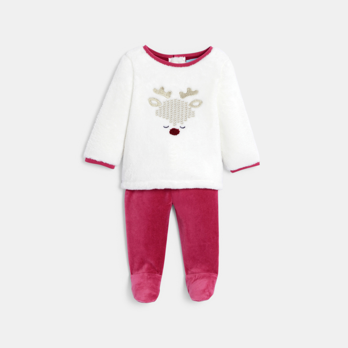 يراقب حيوان الرنة الصغير نوم الأطفال الصغار في هذه البيجامة الناعمة والدافئة المكونة من قطعتين. البلوزة من قماش البوا الناعم بأكمام طويلة مع أزرار كبس على كامل الظهر، وبنطال مخملي مغلق القدمين حتى 12 شهرًا، ومن عمر 18 شهرًا رقبة مستديرة مع أزرار كبس على الظهر، ومطاط أسفل القدمين.