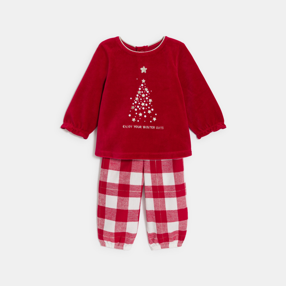 ألوان مثالية لارتدائها في نهاية العام! تحب الفتيات الروح الأصيلة لهذه البيجامات التي تدفئ أمسيات وليالي الشتاء. جزء علوي من المخمل بأكمام طويلة، ومزودة بأزرار كبس بالكامل من الخلف، وجزء سفلي مطاطي من الفانيلا بمربعات من عمر 18 شهرًا.