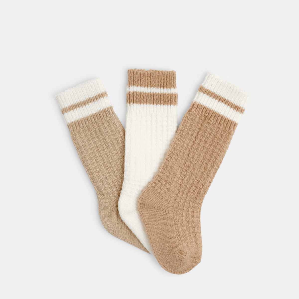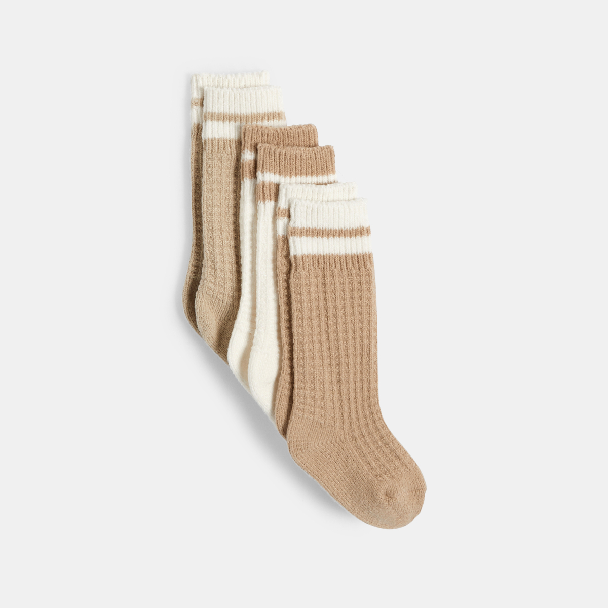 في أقدام الأولاد، جوارب طويلة في أقدام الأولاد من نسيج الجاكار الفاخر عليها نقش قرص عسل النحل. ثلاثة أزواج متناسقة من تشكيلة Obaïbi.