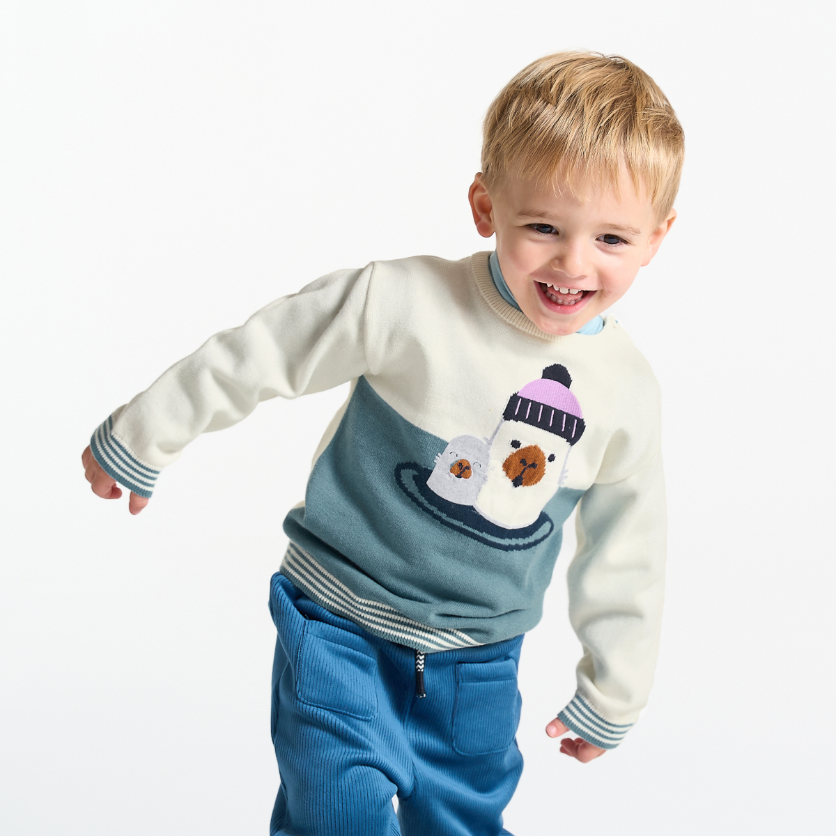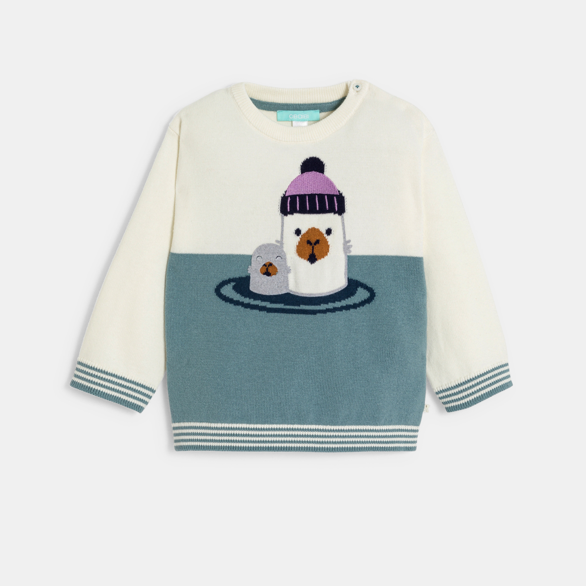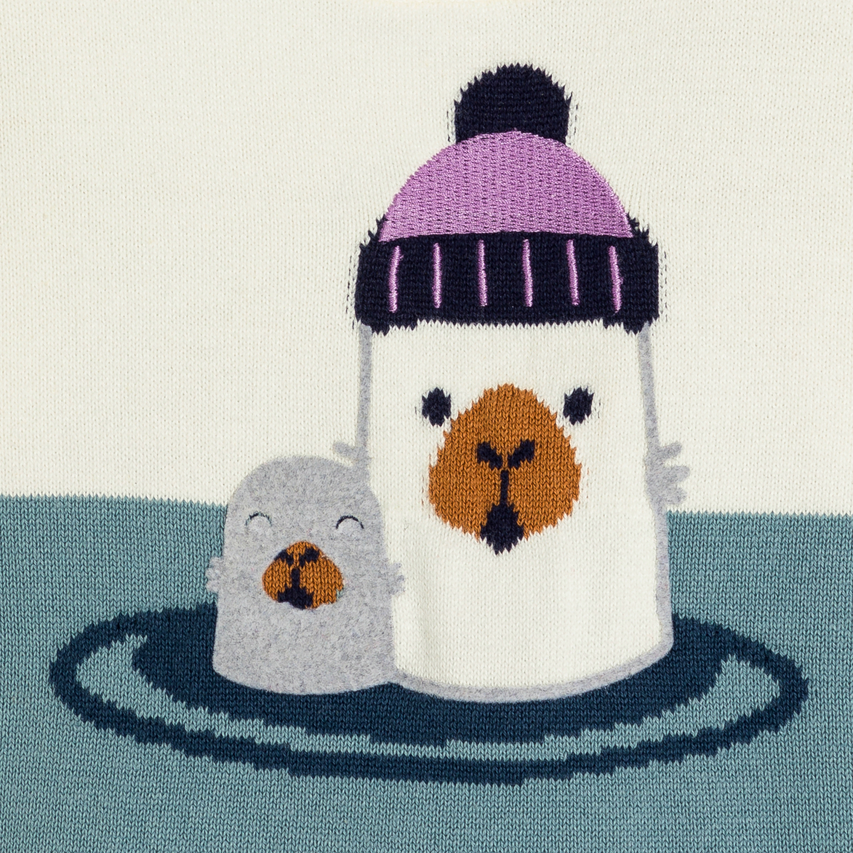 تلعب حيوانات الفقمة في الماء على هذا البلوفر المصنوع من قماش تريكو جاكار. ناعم ودافئ ومريح، يحافظ على دفء الأولاد ويضفي لمسة طبيعية على أي زي. تشطيب بحواف مطرزة. أزرار على الكتف لتمرير الرأس بسهولة.
