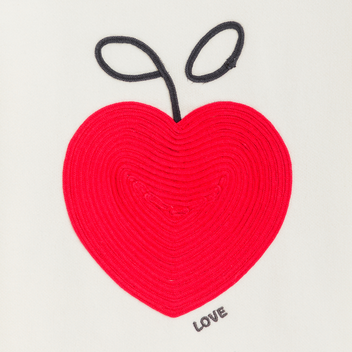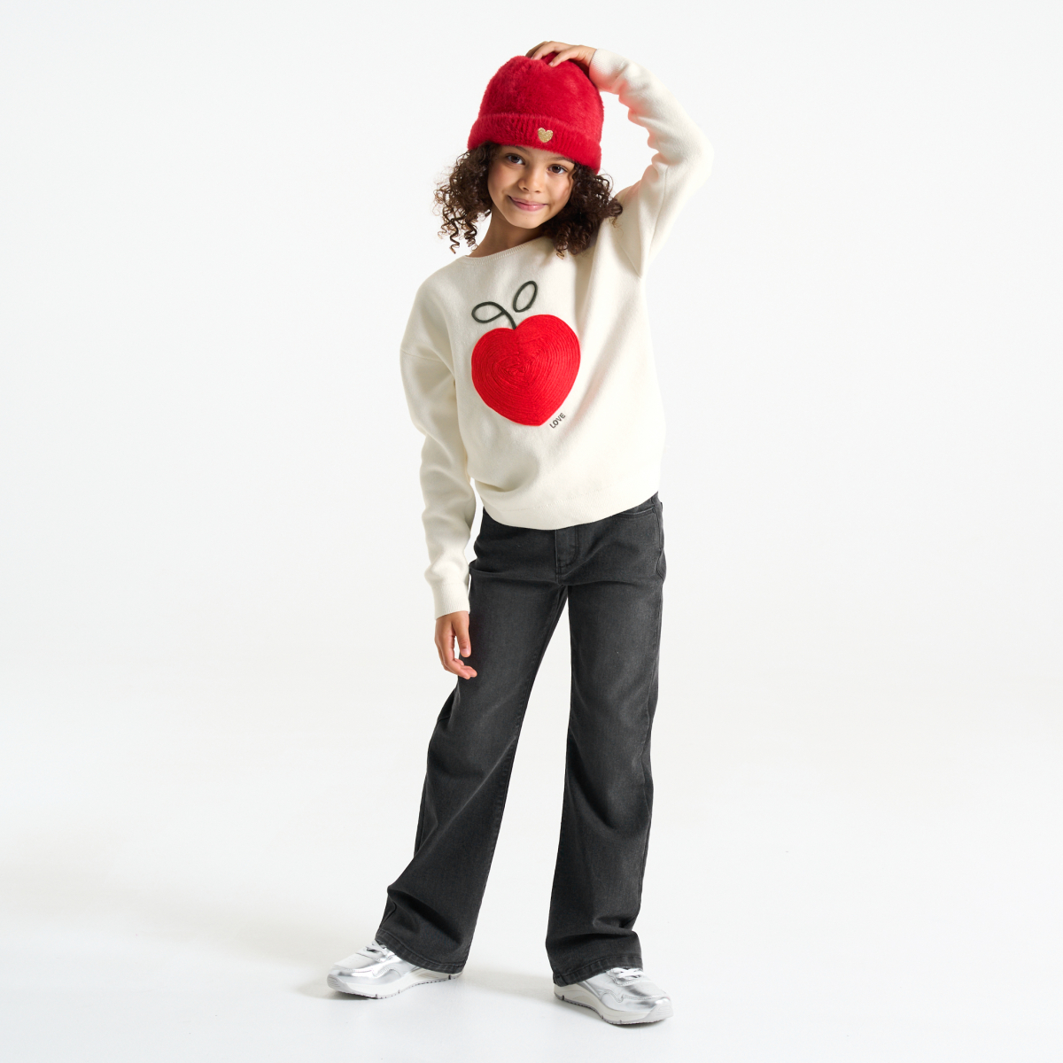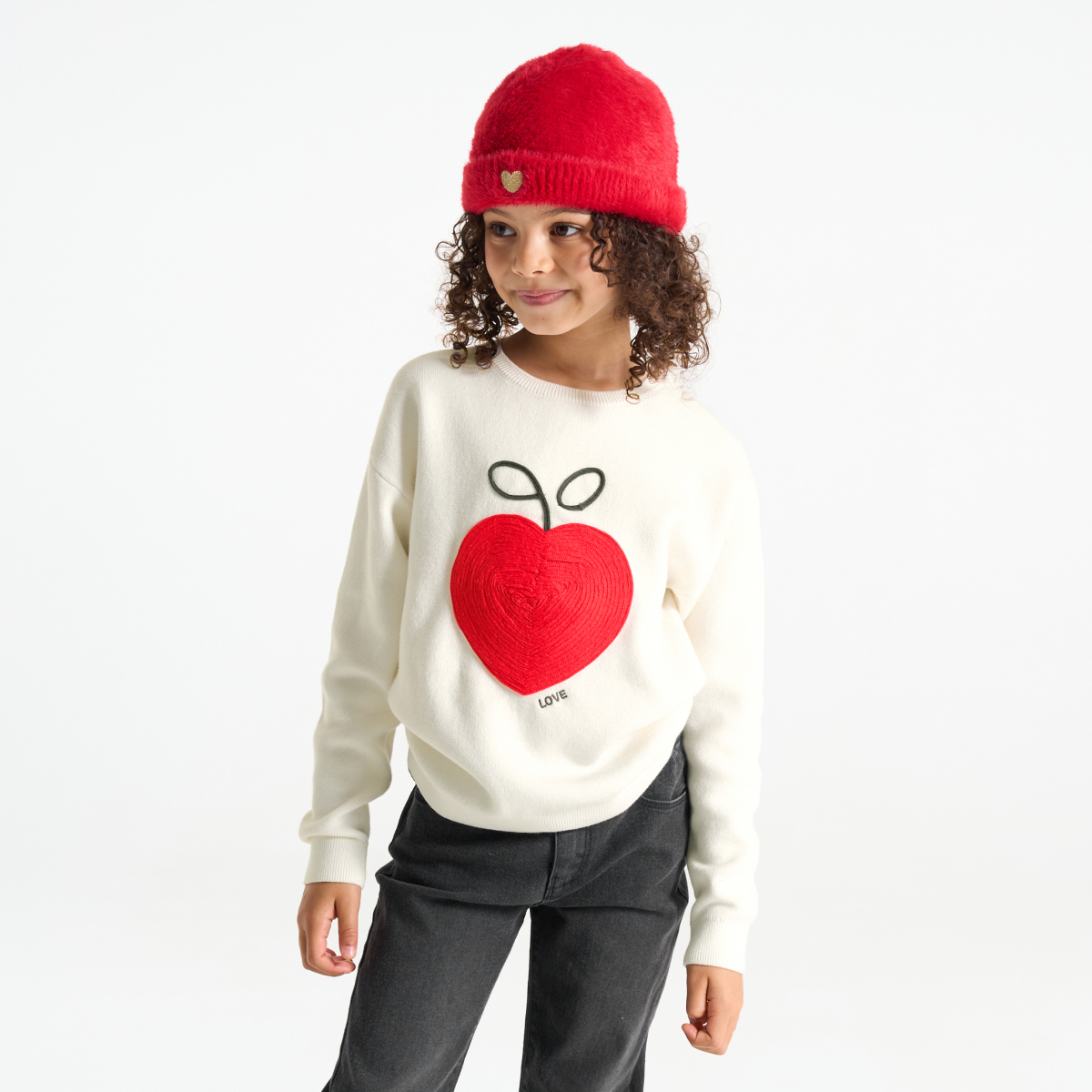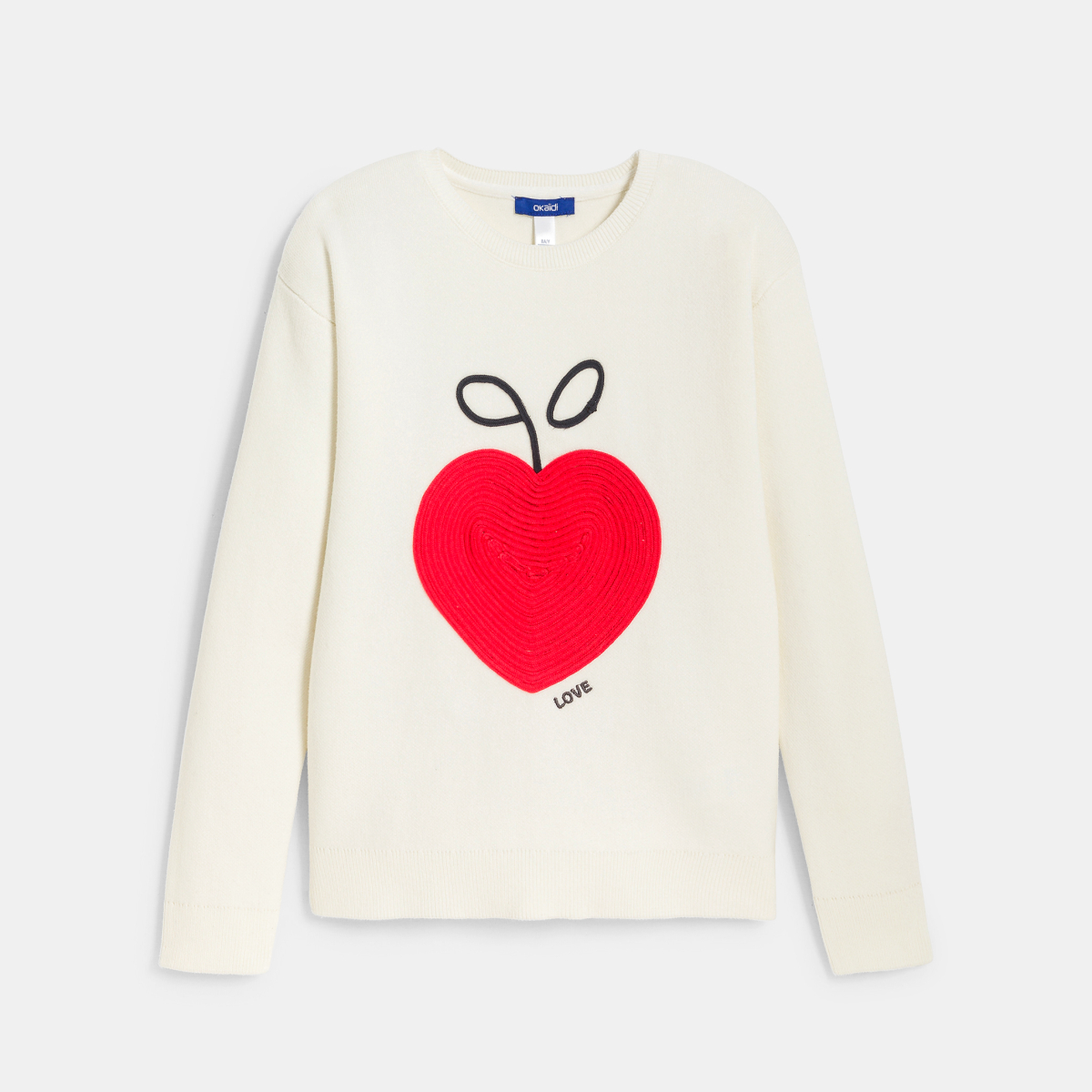 قلب كبير مطرز من التريكو وقماش ناعم جدًا: هذا هو سر النجاح الفوري لهذا البلوفر الناعم! قصة ضيقة قليلًا عند الحافة السفلية. ياقة مستديرة. فتحات الذراعين منسدلة قليلاً. أكمام طويلة. الحافة السفلية مستقيمة. حواف مضلعة.